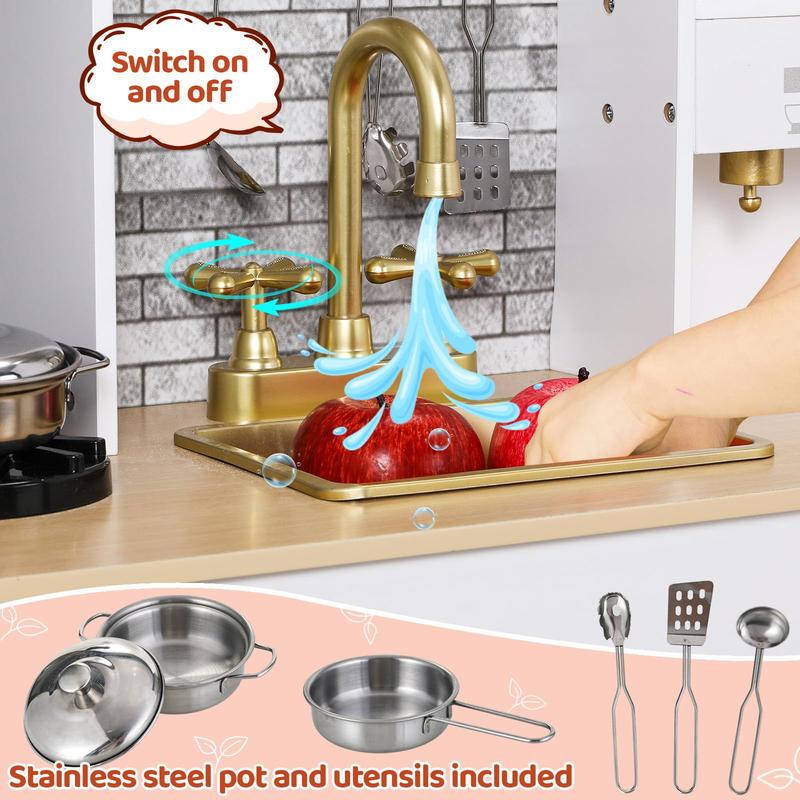 PLENTY OF FEATURES & ACCESSORIES: Wooden toy kitchen features stove with sound & light, sink with faucet, coffee maker, disinfection cabinet, microwave, oven & locker. Comes with 5 stainless steel cookware accessories, including a pot with lid, a pan and 3 cookware.