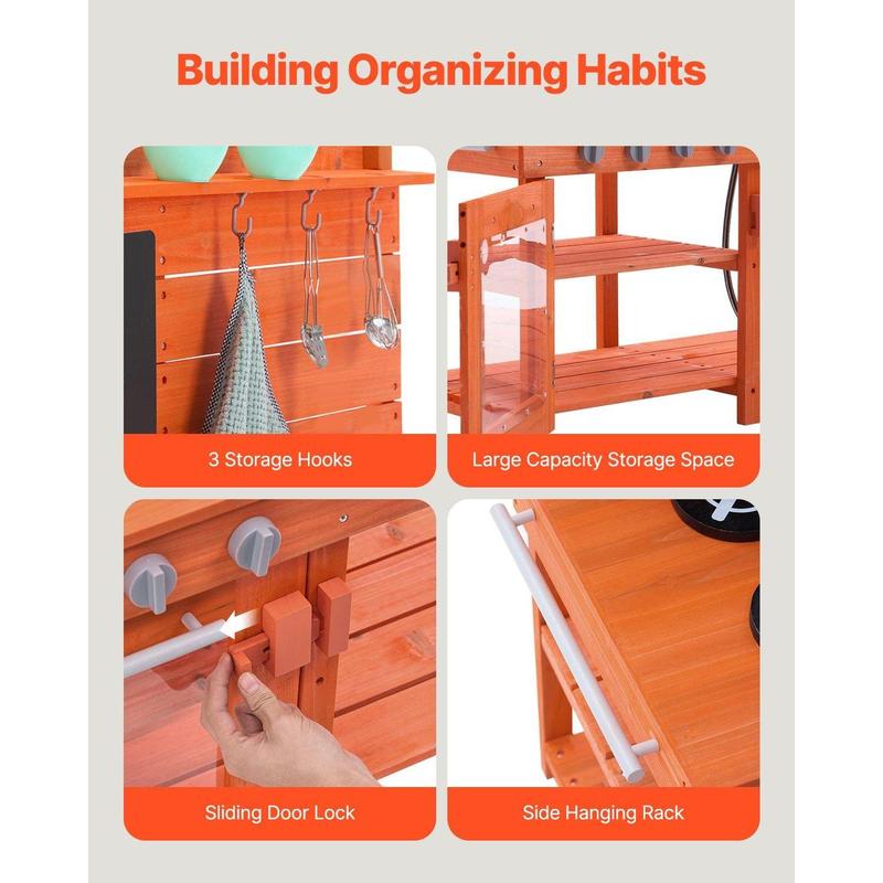 ·A Fun Developmental Gift: This pretend play outdoor kitchen is perfect for birthdays or holiday gifts for children, whether for boys or girls! With a 20.47-inch countertop height, kids can easily reach and organize their play items, helping improve hand-eye coordination. The spacious work area allows children to play with friends, explore the joys of nature outdoors, and improve collaboration and social skills