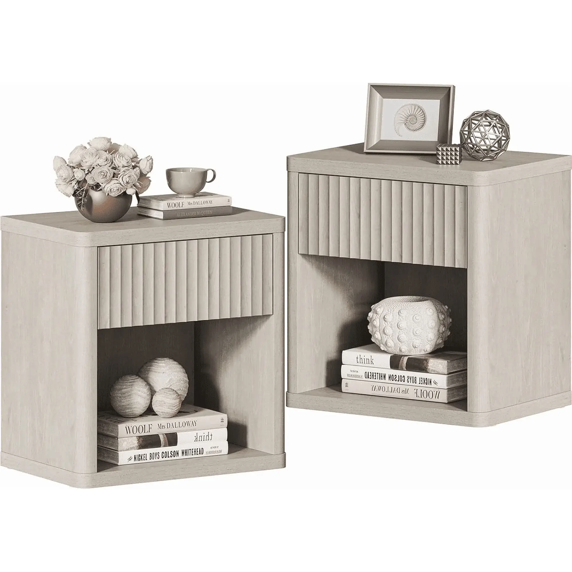 23IN White Oak nightstand with 1 drawer + 2 open groove compartment for bedside storage. Compact size fits most beds; sleek finish matches any decor. Sturdy wooden build for daily use; easy to assemble.