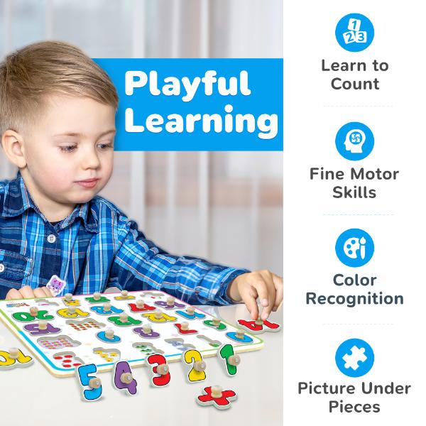 Each jumbo number features an easy-to-grasp peg and matching illustrations underneath to build associations between numbers and quantities. Perfect for Montessori-style learning at home or in preschool!