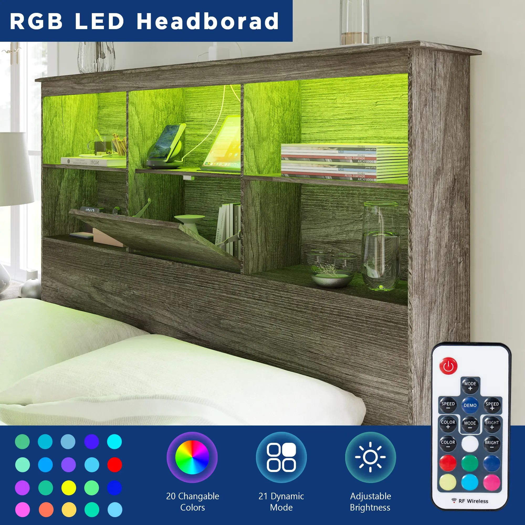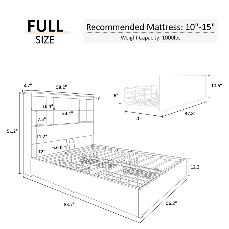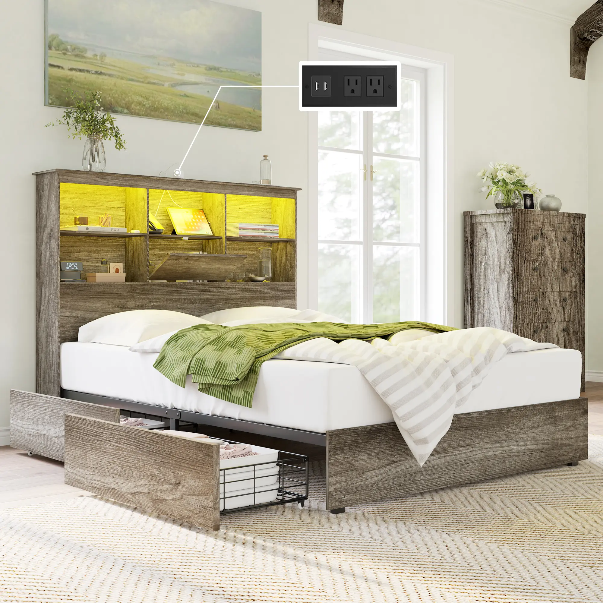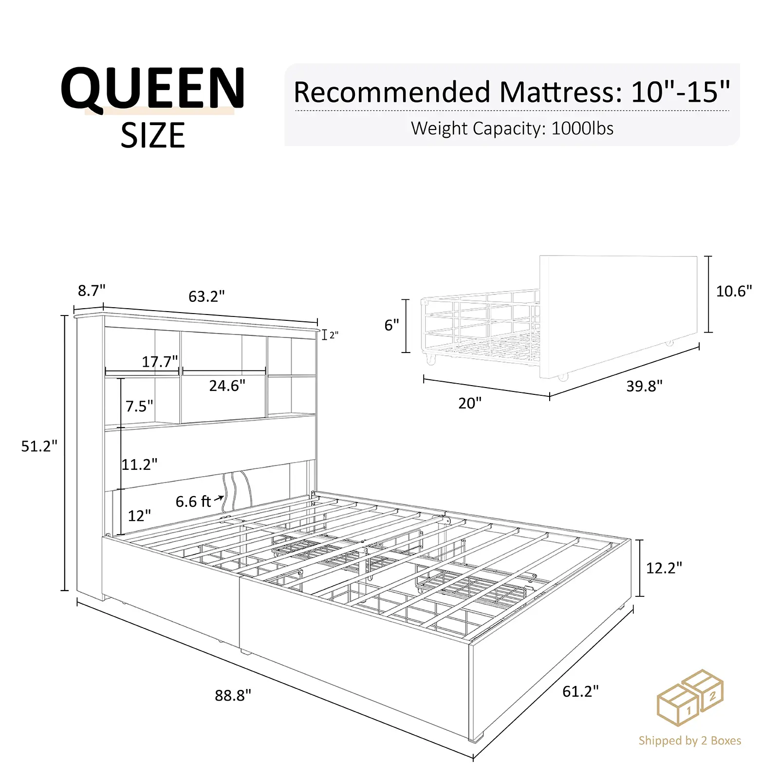 ·AMPLE STORAGE: Bookcase headboard provides 5 open storage spaces, 2 adjustable shelves & a hidden storage area, creating flexible storage options. 4 under bed storage drawers is perfect for clothing.