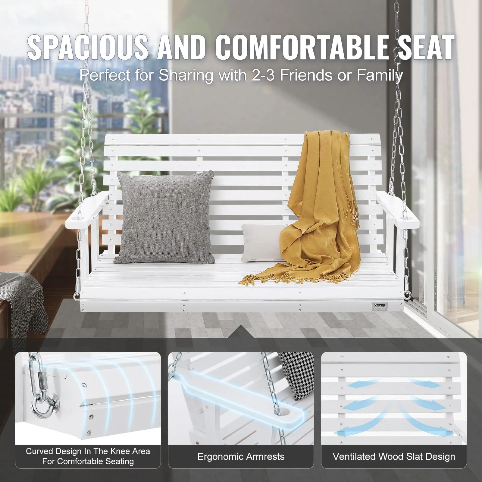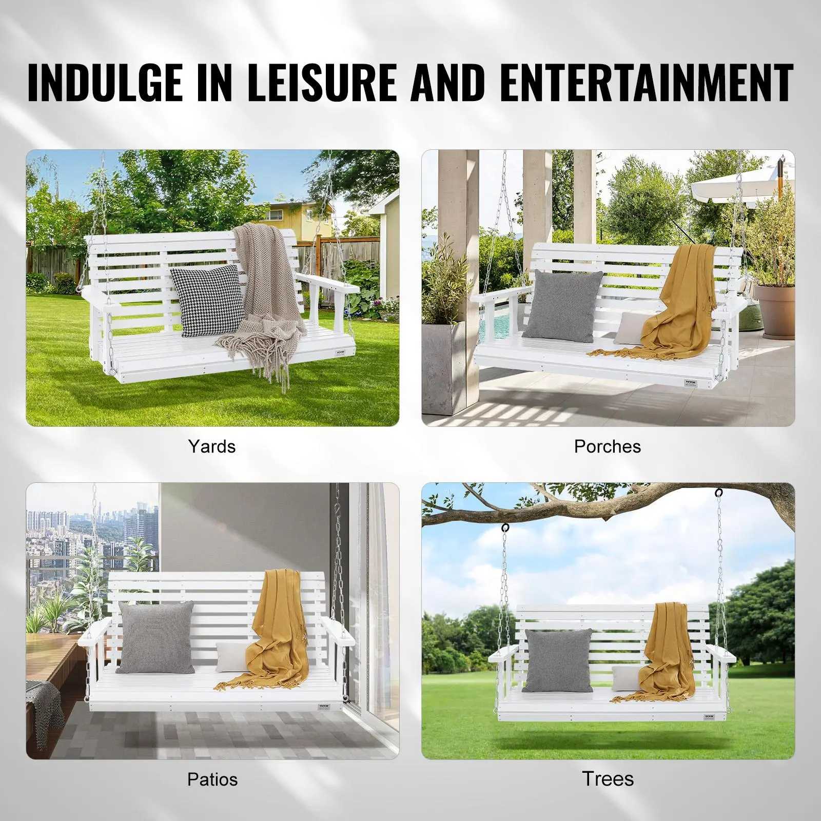 • Weatherproof Durability: Coated with 3 layers of PU paint, the swing's surface is smooth, scratch-resistant, and highly waterproof. The galvanized steel chains are also weather-resistant, ensuring long-lasting use without rust, rain or shine.