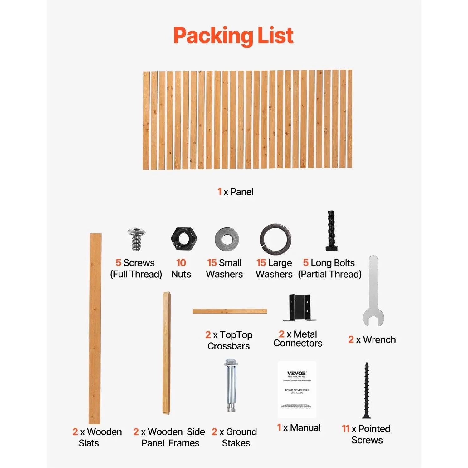·What's Included: 25 wooden slats, 2 wooden side frame panels, 2 ground stakes, 2 metal connectors, 2 top crossbars, 5 long bolts (partial-threaded). 10 pcs of m6 nuts, 15 small washers, 15 large washers, 5 full-thread screws, 11 pointed screws, 2 wrenches, and 1 instruction manual.