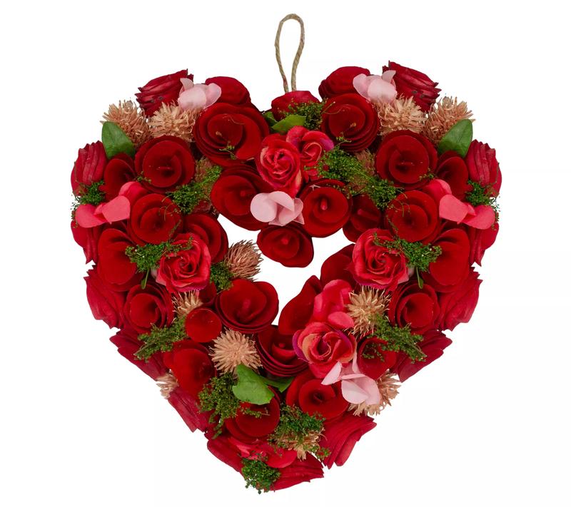 With the holiday season around the corner this unique heart shaped wreath is the perfect addition to your decor. This wreath features red and pink wooden roses and dried flowers with green foliage and moss accents. This artificial wreath will be a staple for your Spring decor for years to come. Product Features: Red and pink wooden rose heart shaped Spring wreath. Pops of green foliage and moss add dimension. Flat back allows wreath to hang nicely against any flat surface. No assembly required. Recommended for indoor use only - if using outdoors place under a covered area. Comes ready to hang from jute cord Dimensions: 13.5"H x 12"W x 2.5"D. Material(s): foam/wood;1 Wooden Rose Valentine's Day Spring Wreath 13.5-Inch