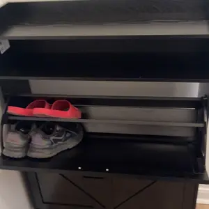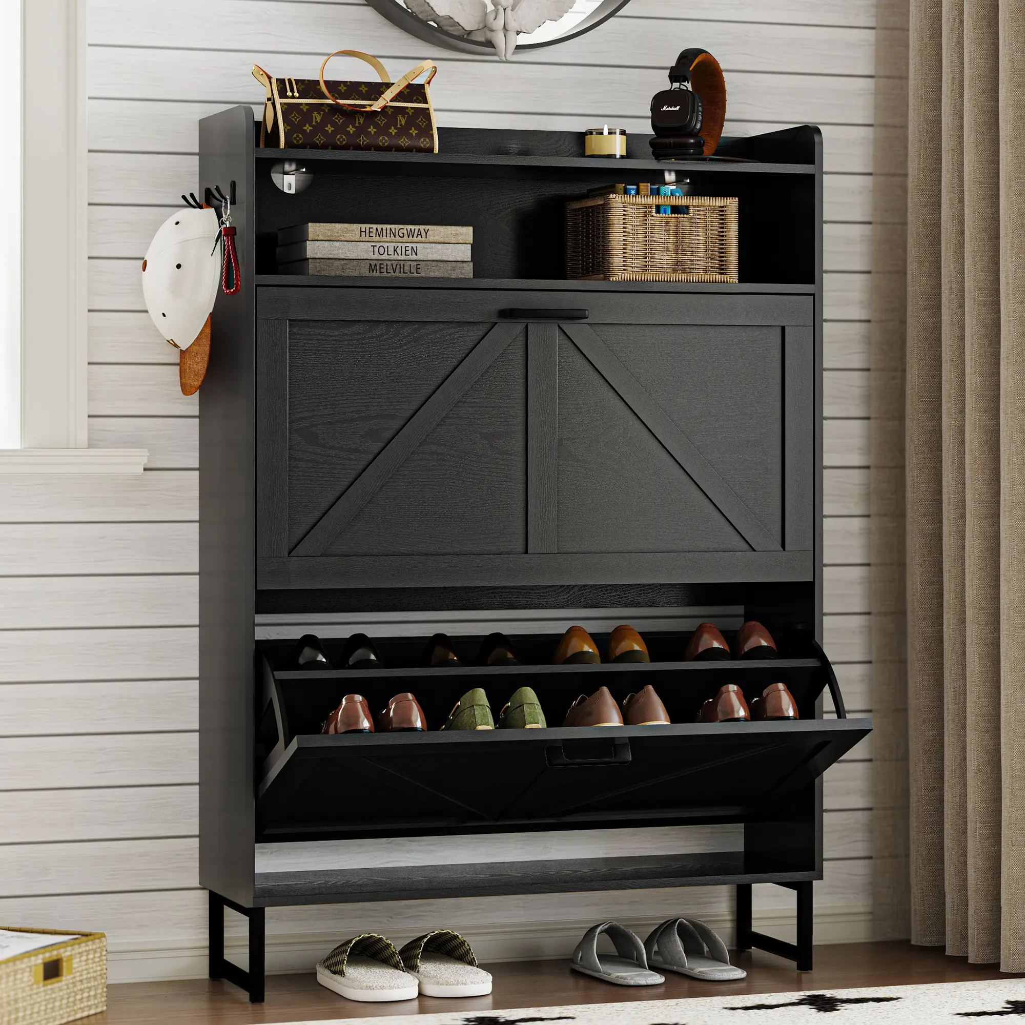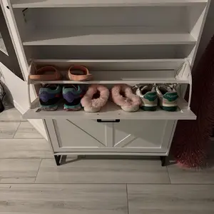 ·Spacious Shoe Storage Cabinet: Shoe cabinet features two large flip drawers with four separate compartments, offering generous storage for different types of footwear. Each cabinet drawer can be adjusted to combine two compartments into one, ideal for accommodating larger or longer shoes. The bottom of the cabinet offers extra space for slippers or a robotic vacuum. The open shelf at the top is ideal for daily essentials, while the flat surface on top provides additional storage without worrying about items falling off. Two metal hooks on the side are perfect for hanging coats, scarves, or hats. Perfect for keeping your entryway organized and tidy.