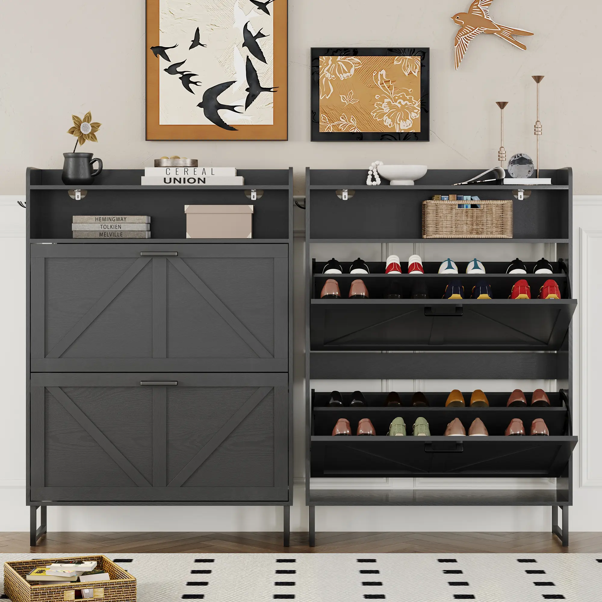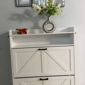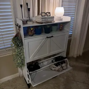 ·Stylish Entryway Shoe Cabinet: Hidden flip shoe cabinet is designed by professional designers, blending different styles to complement a range of room decors. Each detail is crafted with precision, making it an ideal cabinet for entryways, hallways, living rooms, bedrooms, and beyond. Its slim and narrow shoe cabinet design blends seamlessly with surrounding furniture, enhancing the aesthetic of any space without being obtrusive. Ideal for adding a touch of elegance to your home decor.
