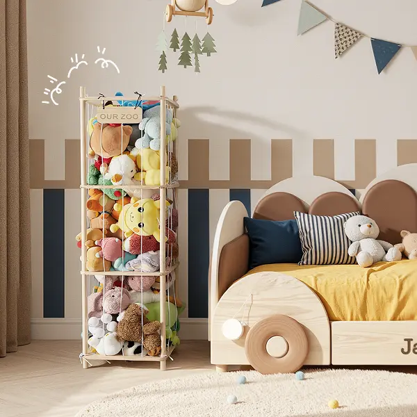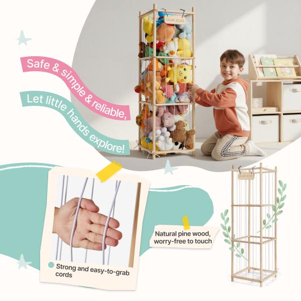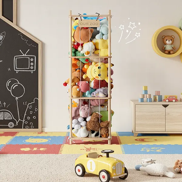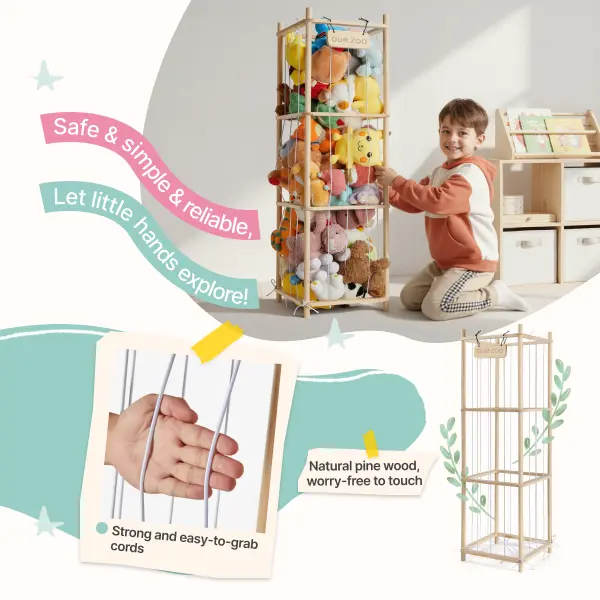 ·【Safe & Eco-Friendly】Made from premium, non-toxic pine wood with sturdy steel screws, this organizer ensures durability and safety for everyday use. It supports small to large plush toys, balls, and cushions, providing a strong and child-safe solution for toy storage.