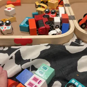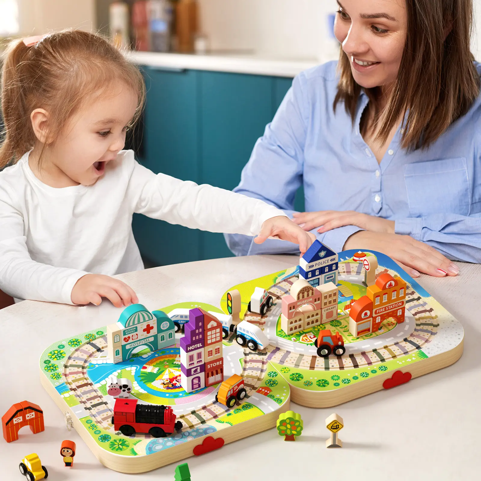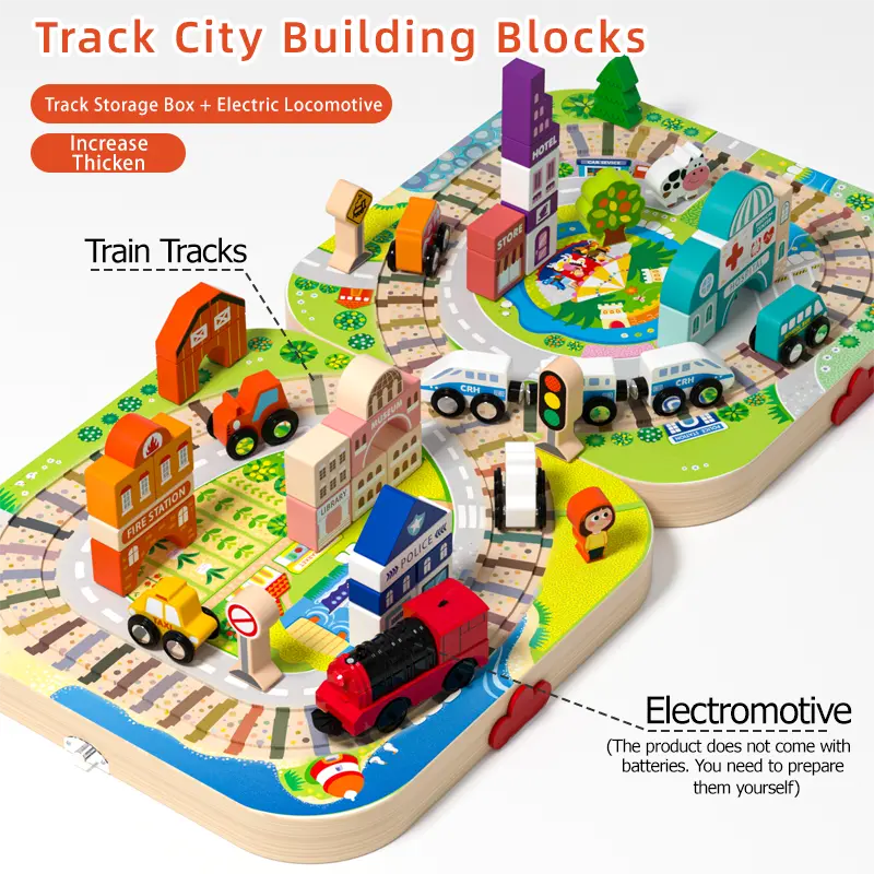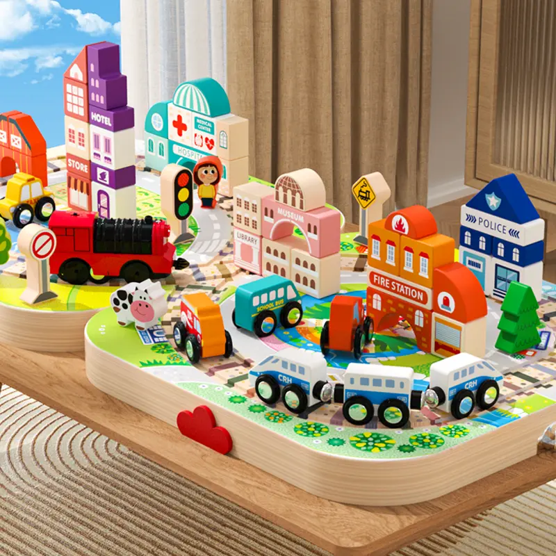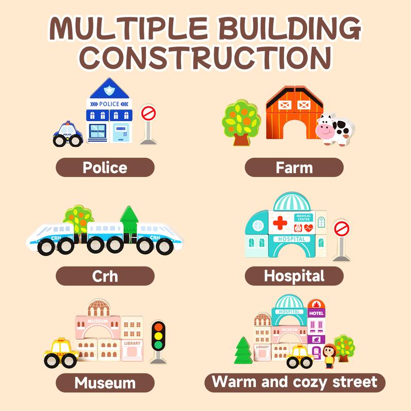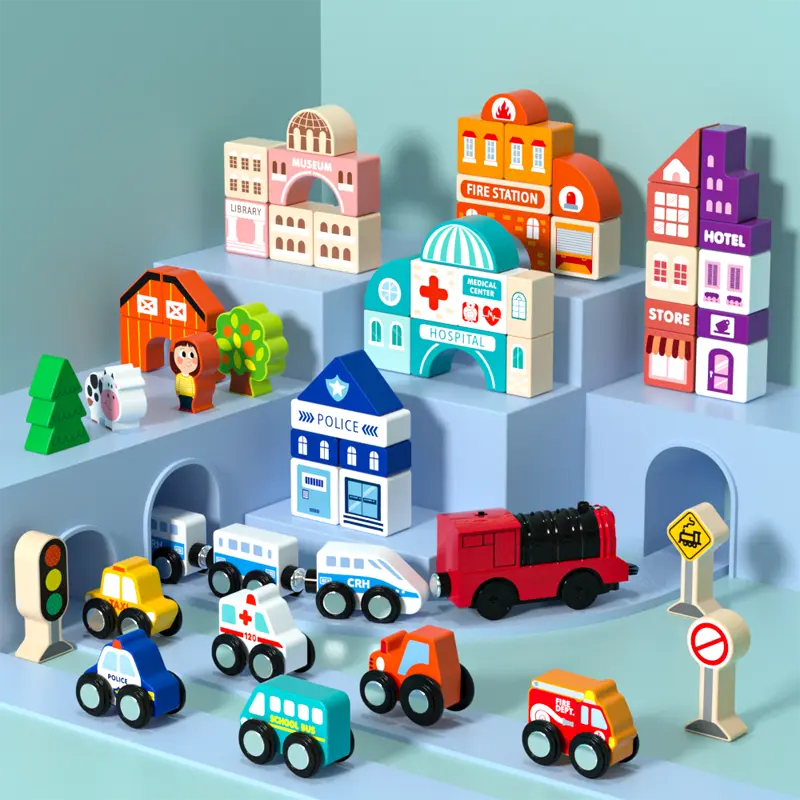 Children develop hand-eye coordination, problem-solving, and creative thinking while playing with the Wooden Track City Blocks.