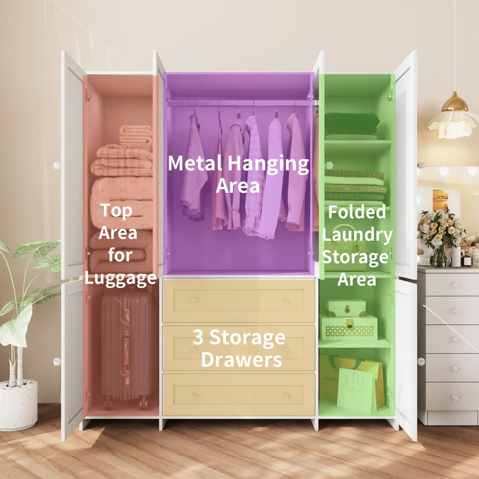 I bought this armoire closet and it's beautiful. It's fantastic for storing anything you want. It makes the room look really high class. But most important it has plenty of space for clothes, and for more. I truly recommend it.