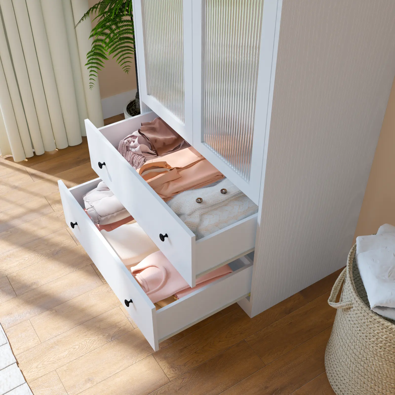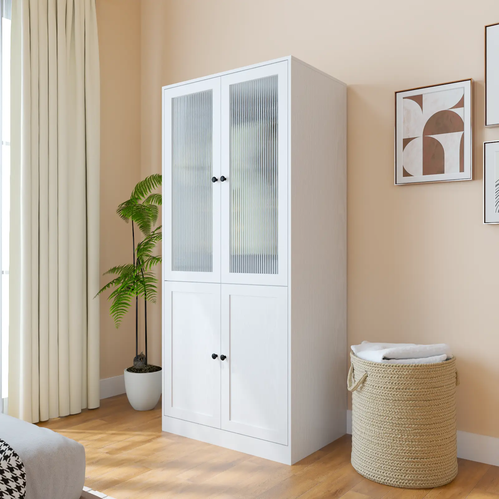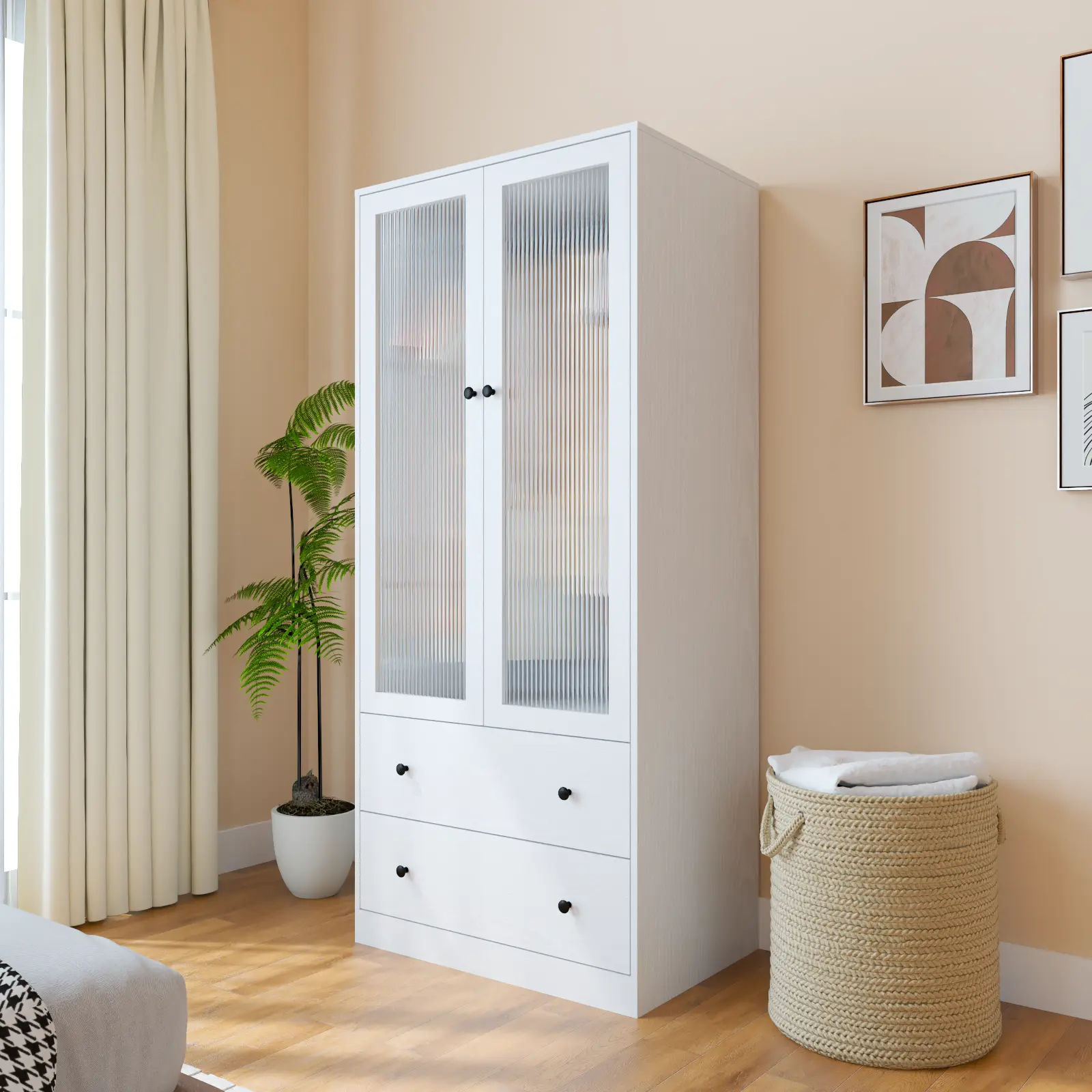 Crafted in wood with a modern minimalist aesthetic, this wardrobe combines clean lines with refined details. The fluted glass doors add elegance while keeping dust out. Blends seamlessly into bedrooms, kids rooms, hallways, or living rooms—enhancing both function and style.