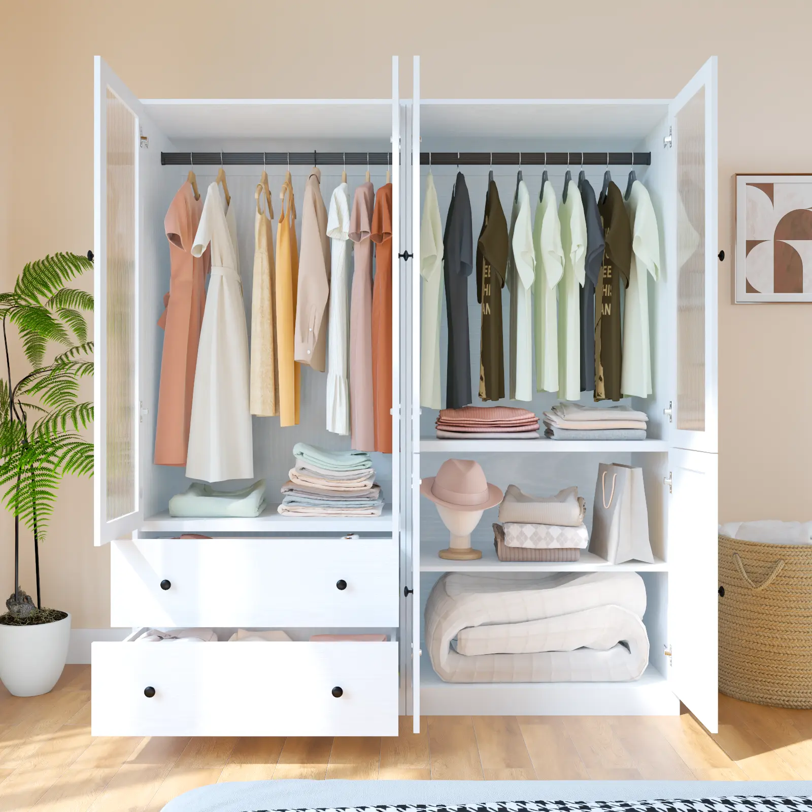 A -- 2 Doors + 2 Drawers: Ideal for long garments like coats, dresses, and overcoats. The bottom drawers neatly store accessories such as scarves and gloves.