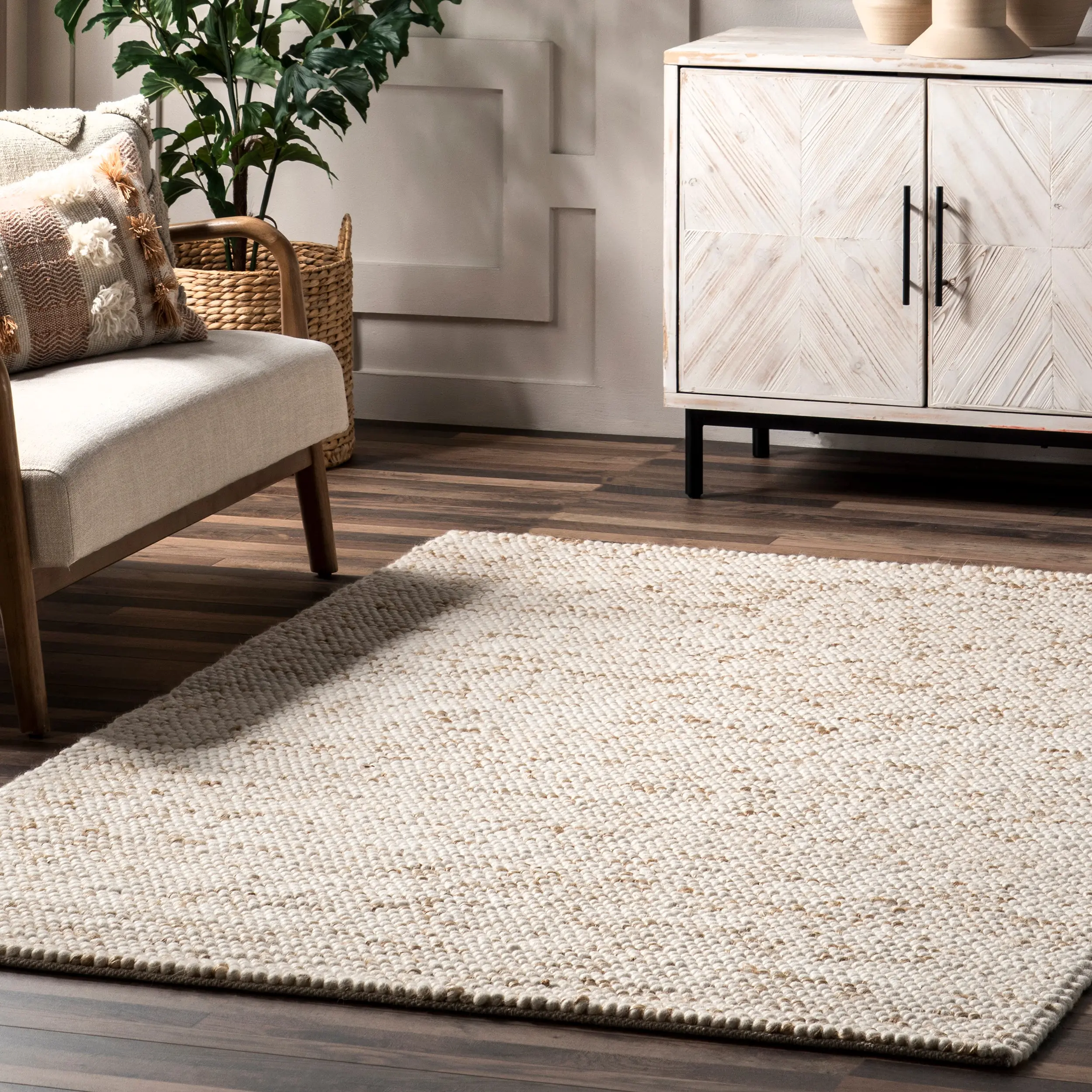 Create the cozy space you’ve always wanted with this wool area rug. Made from a blend of wool, jute, and cotton fibers, this floor covering will surely make a statement in any room it’s placed in. The handmade textured rug features a beautifully detailed casual pattern and blends seamlessly with any décor from modern to bohemian. Enjoy every part of your home with our pet-friendly and easy to care for area rugs.