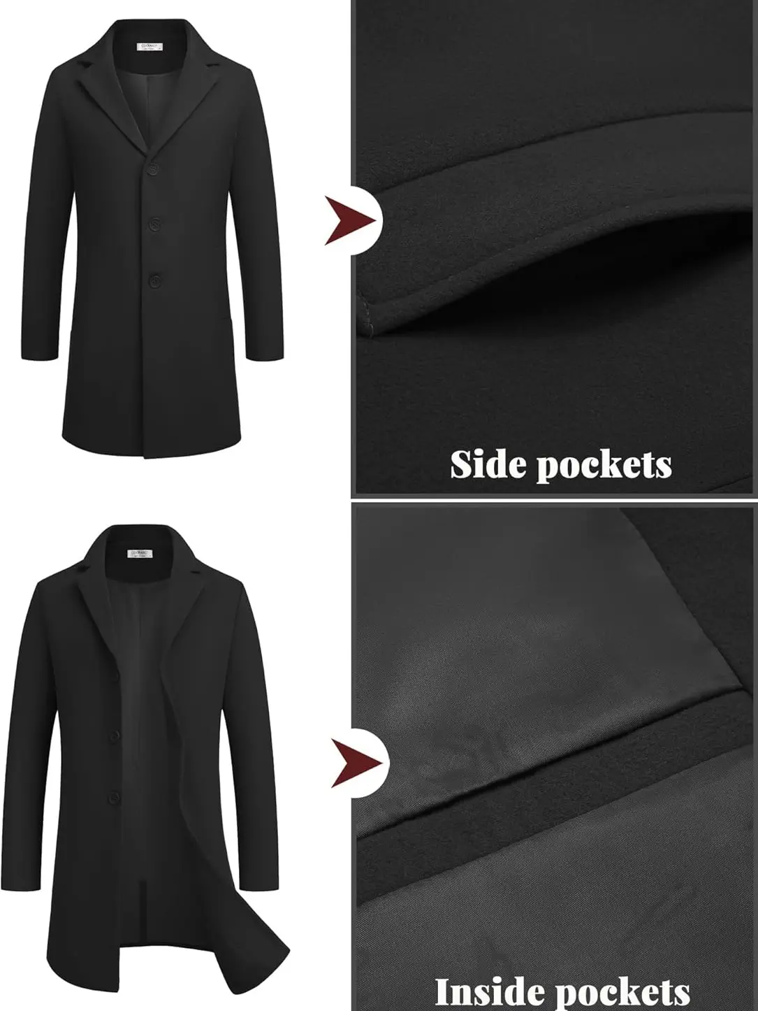 ·PRACTICAL POCKETS - 2 outside pockets, 2 inside pockets. You can put your hands in the pockets to keep warm and the pocket can also hold small items like leather gloves, sunglasses, phones, wallets or something else. This wool blend peacoat features a large capacity inner pocket, which offer you enough capacity to store your cards or any other small belongings.