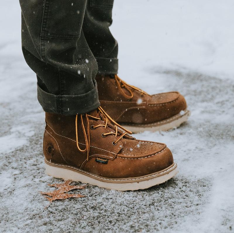 ROCKROOSTER Wedge Work Boots for Men, 6" Steel Toe Waterproof Industrial Construction Boots. These boots conform to the American Standard ASTM F2413, ensuring safety while hiking, hunting, or working. The steel toe cap provides robust protection. Ideal for wet conditions, these boots protect your feet from the elements.
