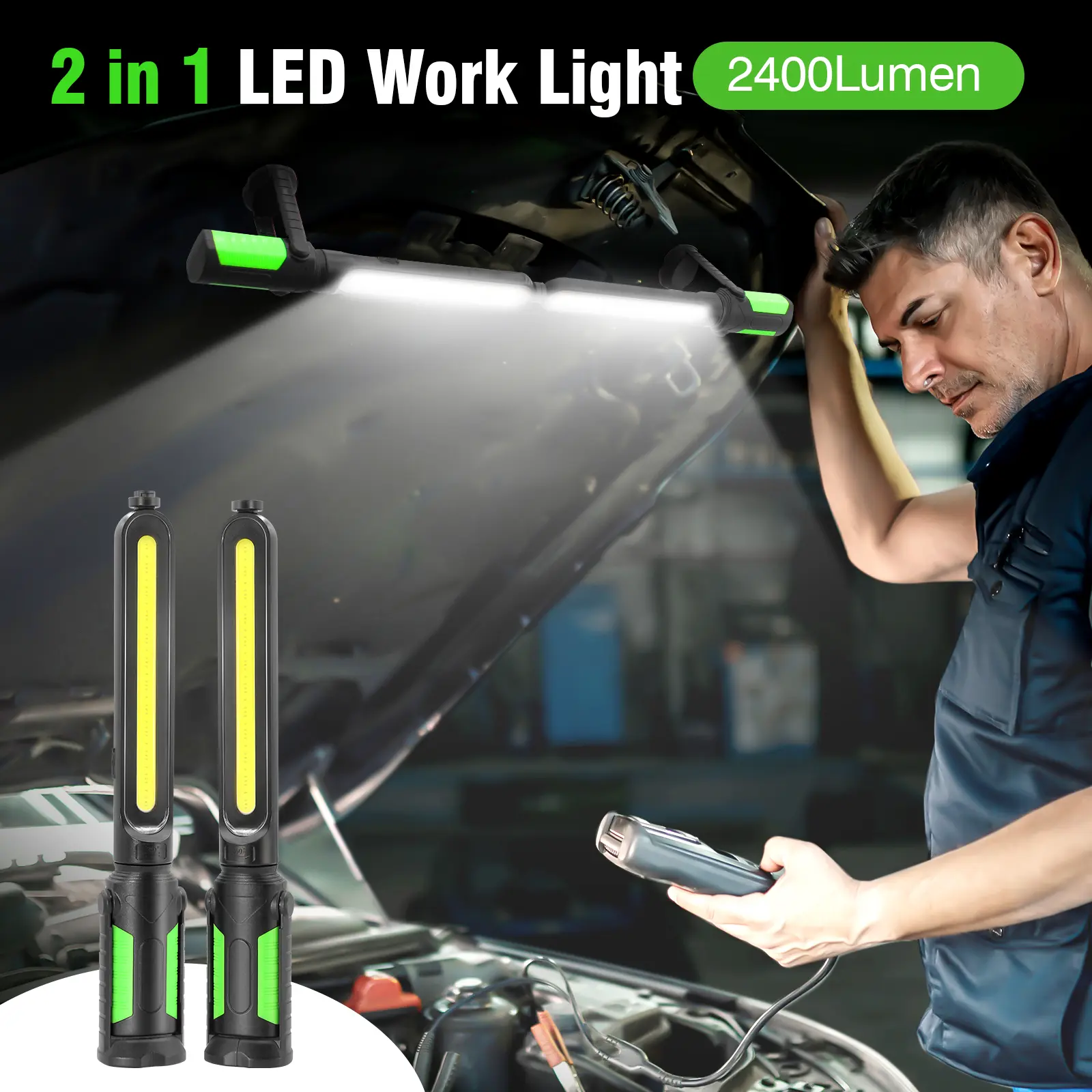 🔍 Flexible and Versatile Design- Dual Functionality: Can be used as two independent handheld lights or connected for higher brightness.- Magnetic Work Light: Offers three brightness levels: high, low, and red light flash.- Exceptional Lighting: Provides up to 2400 lumens with a 13-inch COB board.