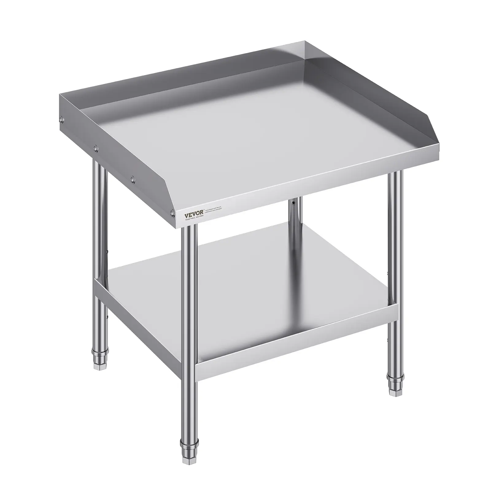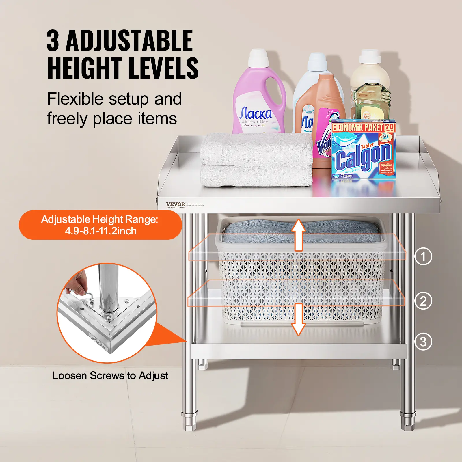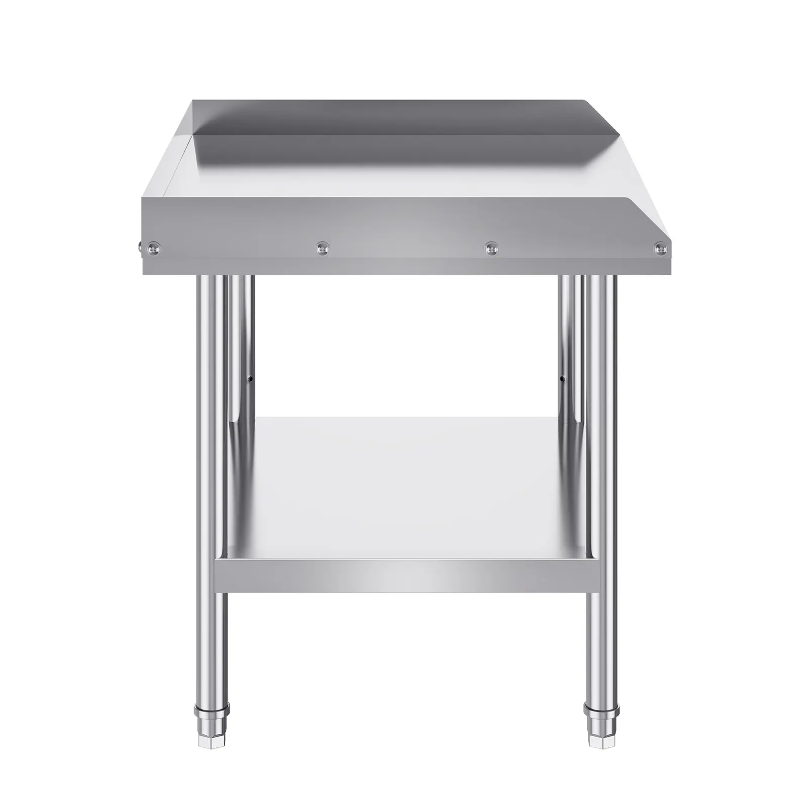• User-Friendly Design: Featuring 3-level adjustable shelves, this work table offers the most user-friendly and practical functionality. Simply adjust the shelf height with screws to accommodate items of different sizes. The 2-inch edge backsplash prevents valuable equipment and supplies from sliding off the table and also protects against water splashes.
