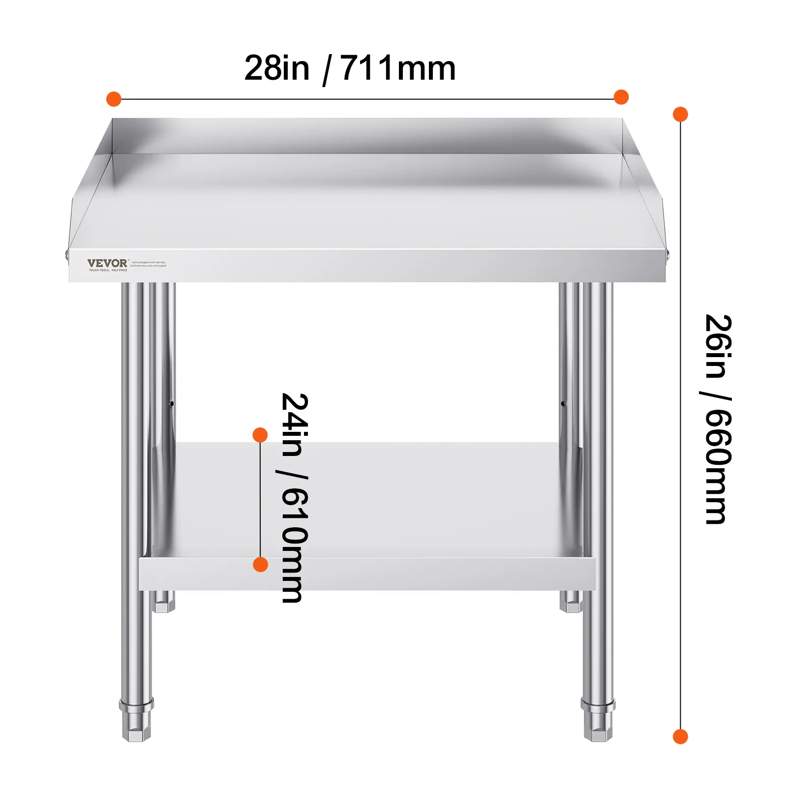 • High-Quality Stainless Steel: This work table, measuring 24 x 28 x 26 inch, is made from SUS201 stainless steel for the tabletop, shelves, and legs. It offers superior rust resistance, a sleek appearance, and a smooth surface that is easy to clean with a simple wipe. NSF certified, it meets strict public health standards, ensuring long-lasting protection for your health.
