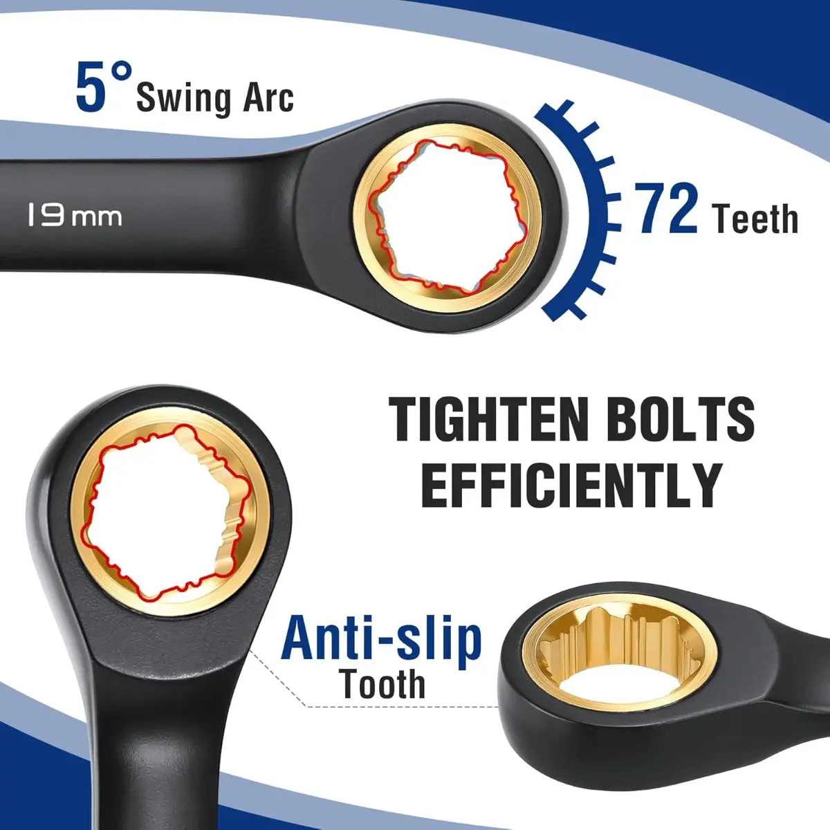 ·The ratchet's anti-slip tooth design keeps the wrench head tight, even when fasteners have become rounded due to long-term wear; When compared to other ratchet wrenches, this set boasts increased anti-slip properties by 30%, making it a wise investment