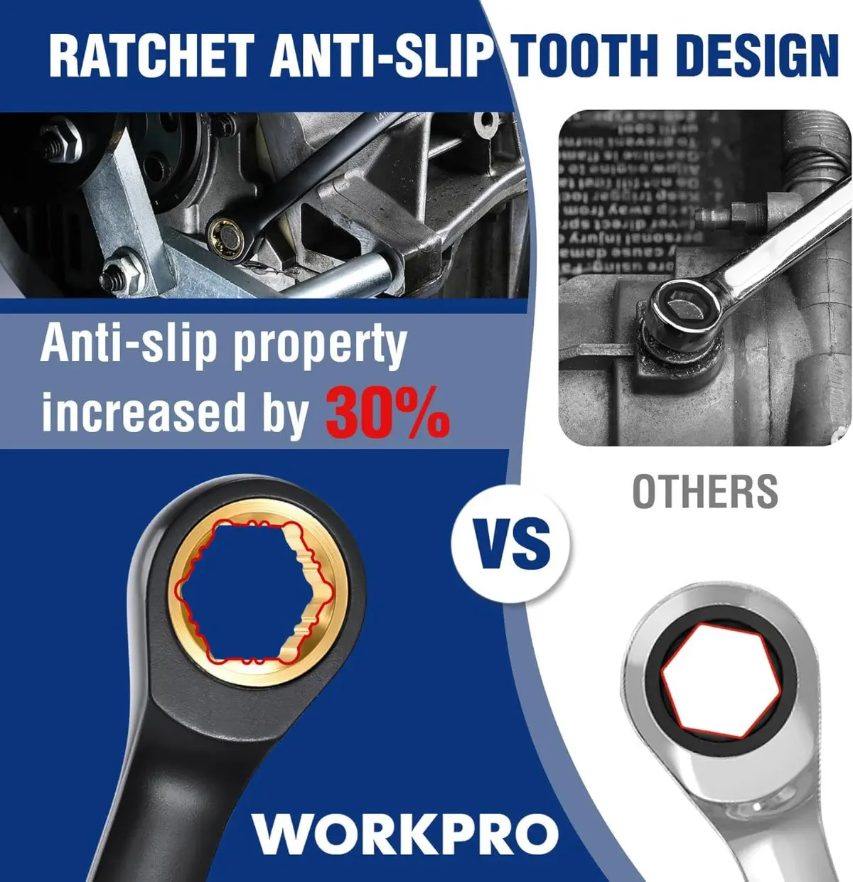 ·The WORKPRO extra-long ratcheting wrench set is constructed with premium chrome vanadium steel, making it strong and resilient; With heat treatment and black electrophoretic coating, this metric wrench set excels in anti-corrosion and durability, ensuring it lasts for years to come