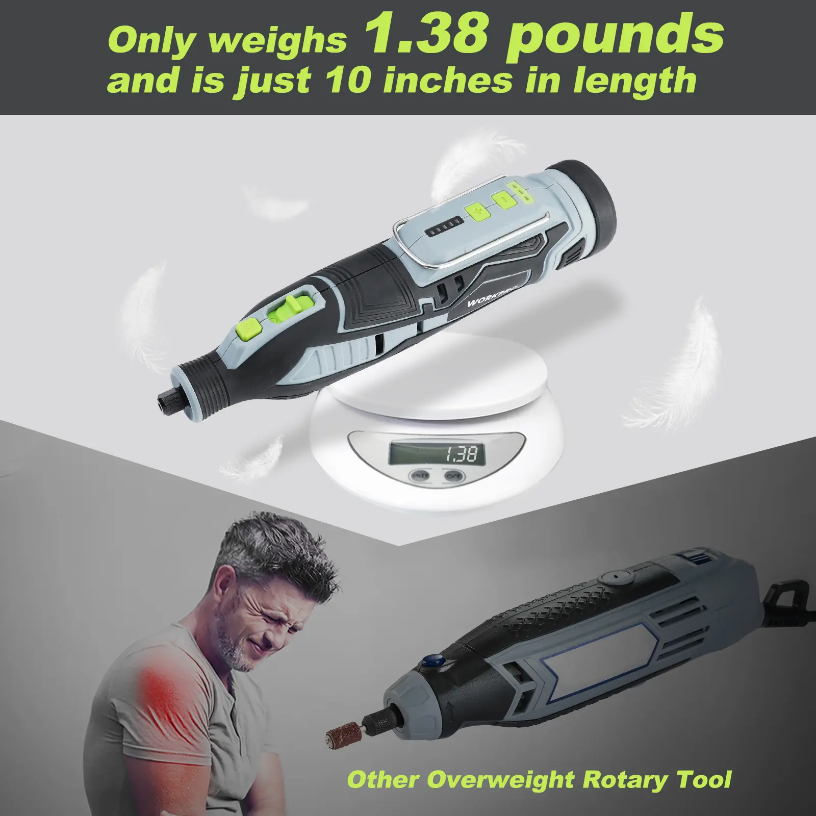 ·Compact & lightweight: The entire rotary tool only weighs 1.38 pounds and is just 10 inches in length. It is an excellent choice for those who don't want a cumbersome cord attached to their tool. The rotary tool is equipped with a hook, hanging in the air with a rope, saving effort for long hours of work. The tool has very little vibration or sound, so you won't have that buzzed hand feeling either.