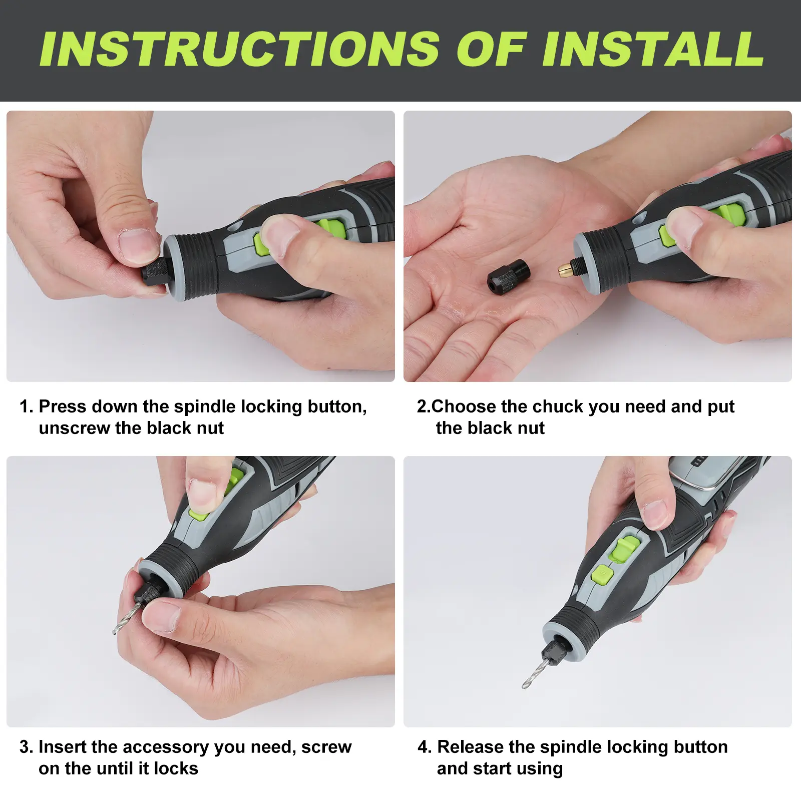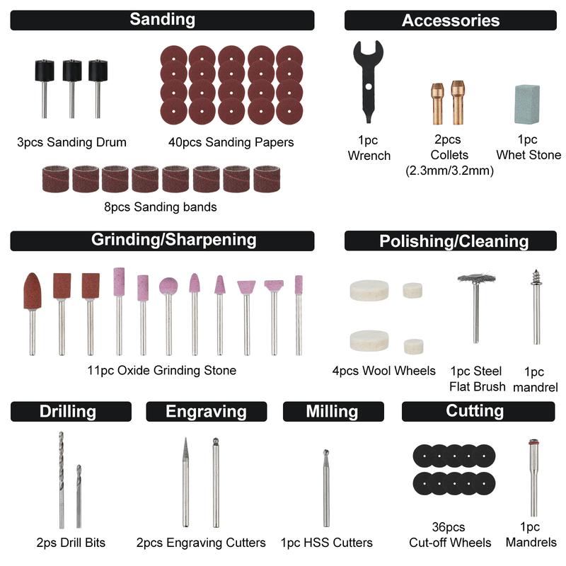 ·Perfect for Kinds of Materials: The cordless rotary Tool kit includes 114 accessories in total, with grinding stones, sanding pads, felt wheels, mandrels, and much more. It comes with two sizes (3/32" & 1/8" ) of universal chuck, allowing you to change accessories on the Rotary tool quickly and easily. The number and variety of accessories make this tool perfect for crafters working with many materials. All accessories can easily be stored in a plastic case.