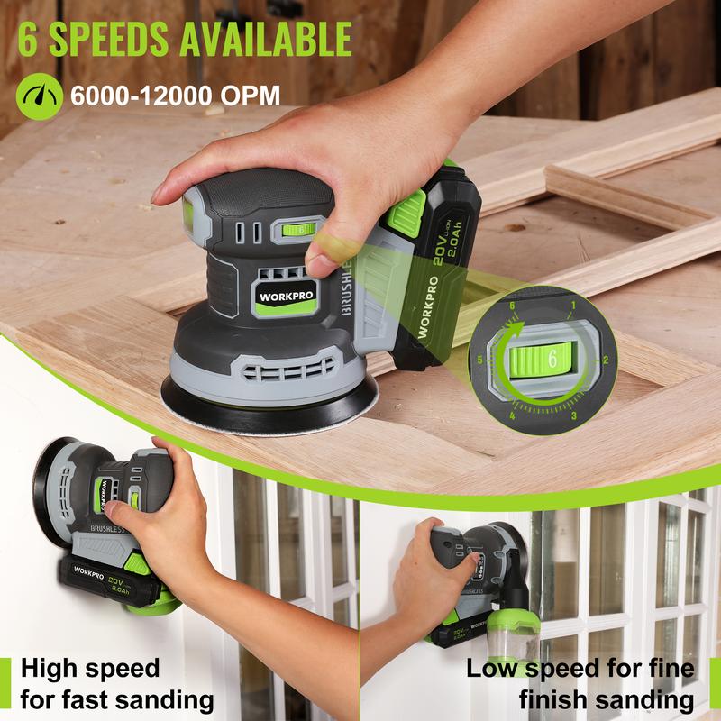 ·POWERFUL BRUSHLESS MOTOR - Upgraded WORKPRO cordless orbital sander will provide plenty of power with the 2000mAh large-capacity battery. The brushless motor does not spark and runs quietly, thus offering a decent life compared to a brushed one.