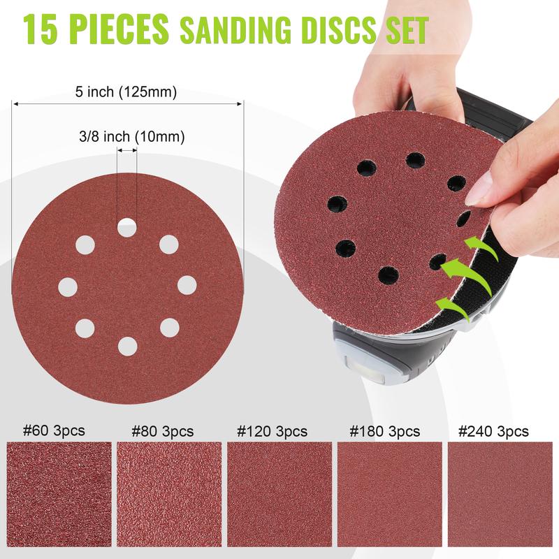 ·15-COUNTS MULTU-GRIT SANDPAPER - Our sanding discs set provides you with the multi-grit sandpaper you need. You will get a total of 15 orbital sander pads of 5 different grades including 60 grit, 80 grit, 120 grit, 180 grit, and 240 grit. Hook-and-loop discs are easy to remove and replace.