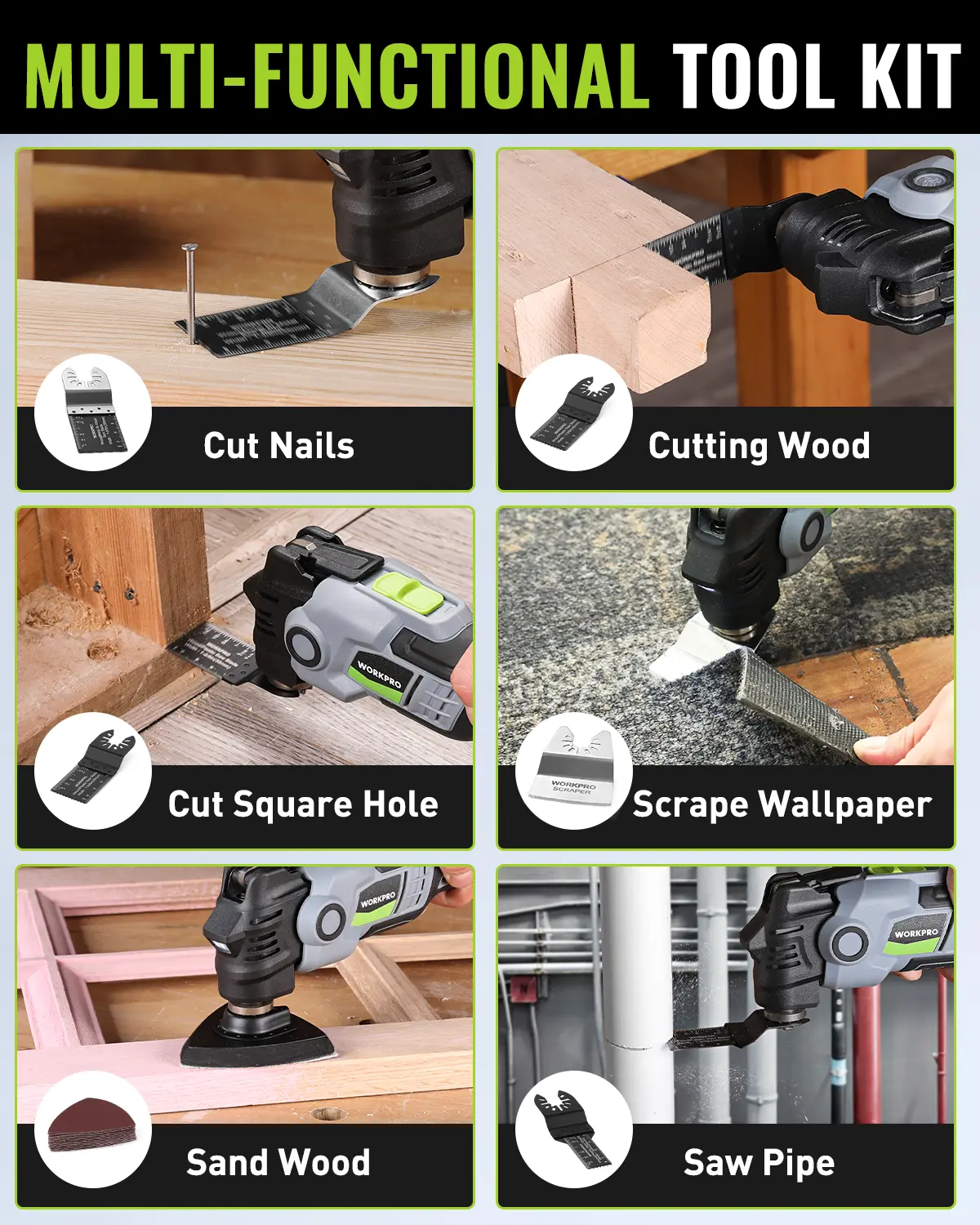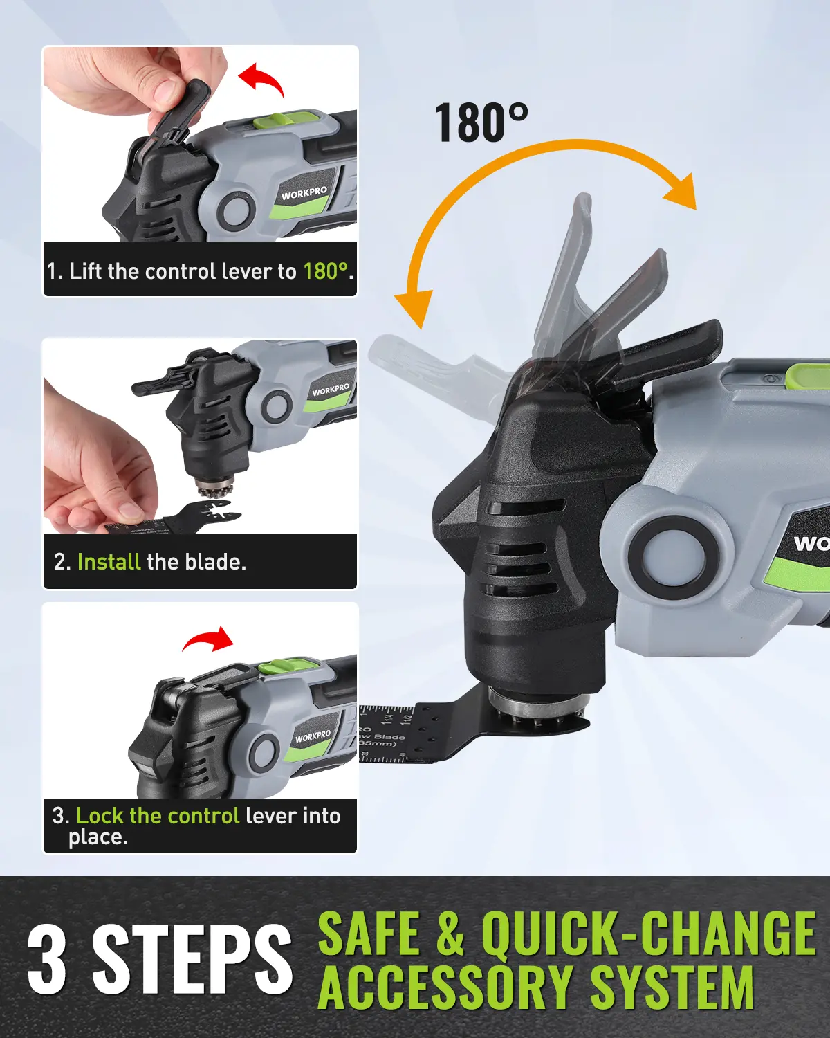 ·Tool-Less and Universal Fit: Flip the button, change the saw blade, and press to secure—no spanner needed. The WORKPRO multifunctional oscillating saw's universal interface is compatible with most accessory brands, saving you time and effort