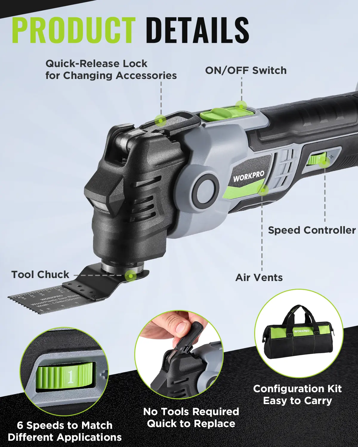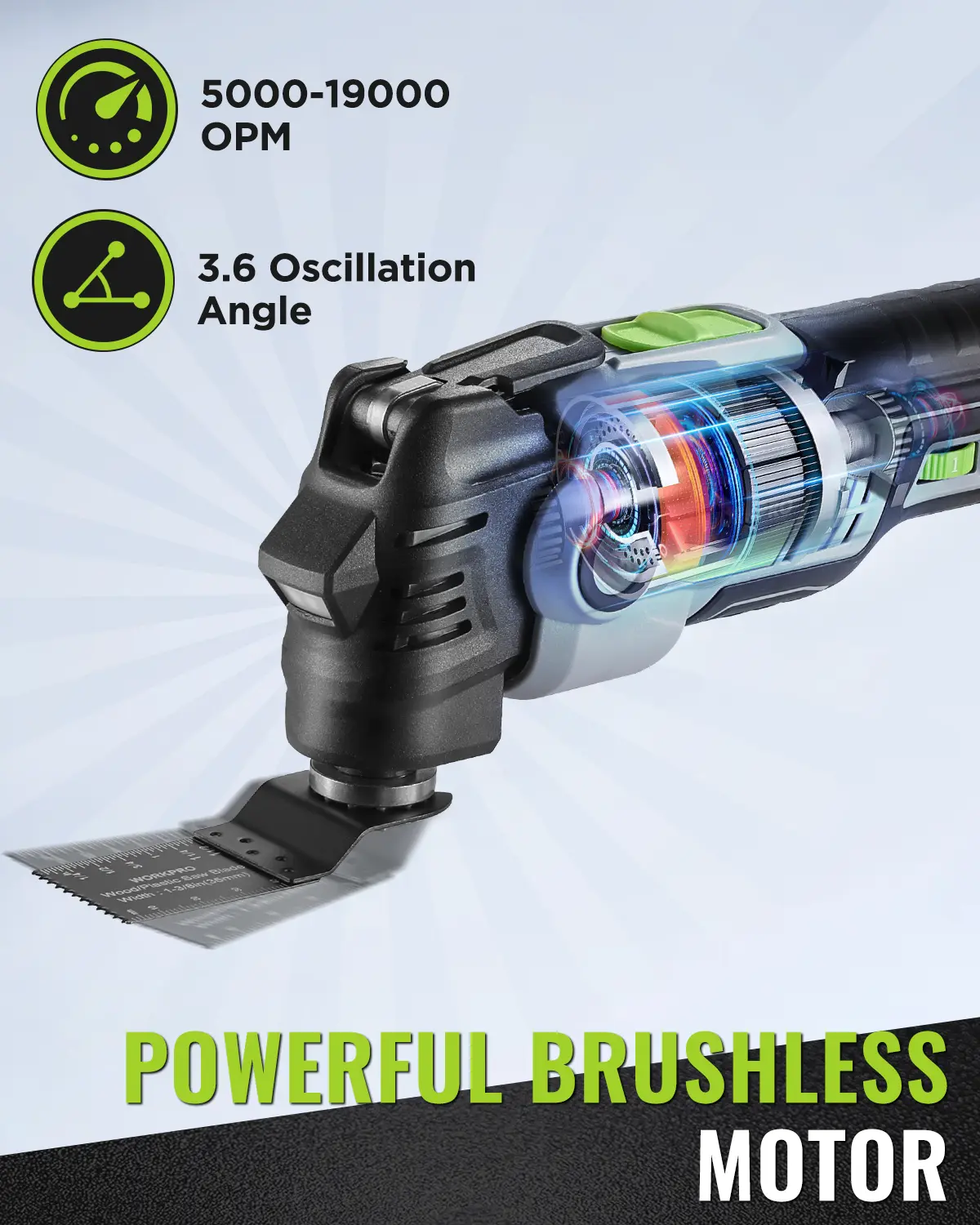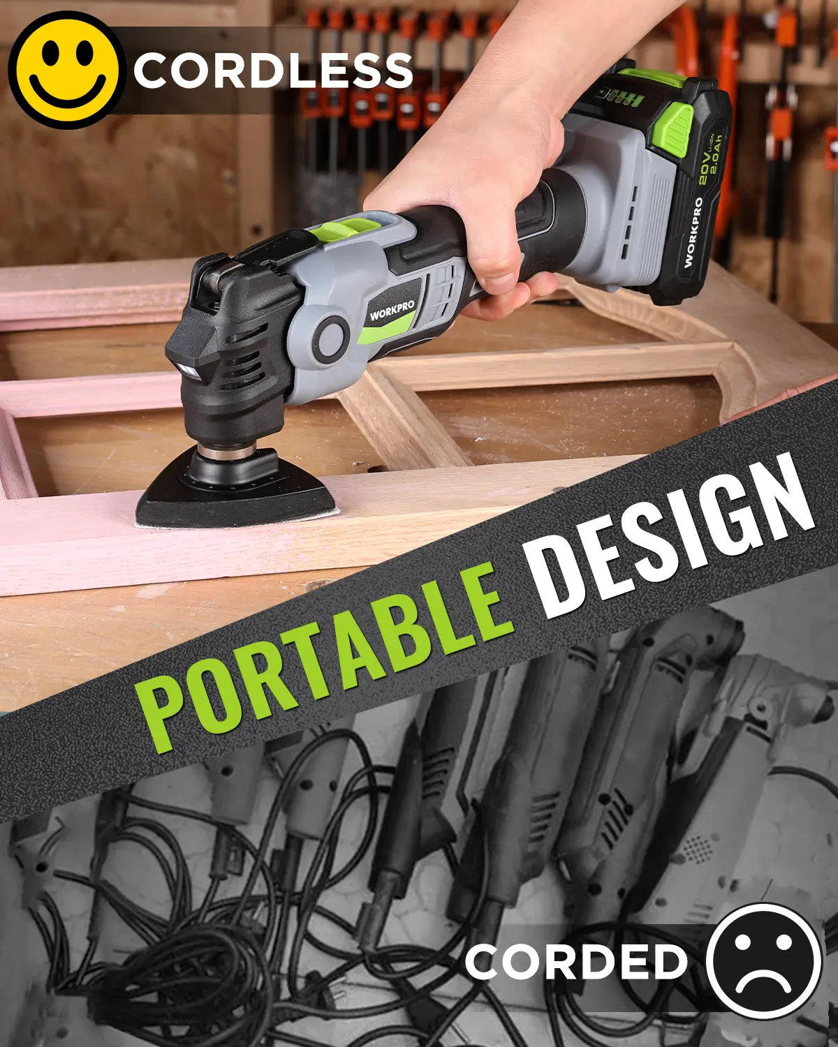 ·Powerful Motor: The brushless motor of the WORKPRO oscillating tool delivers up to 19,000 OPM for efficient cutting, sawing, trimming, grinding, and sanding