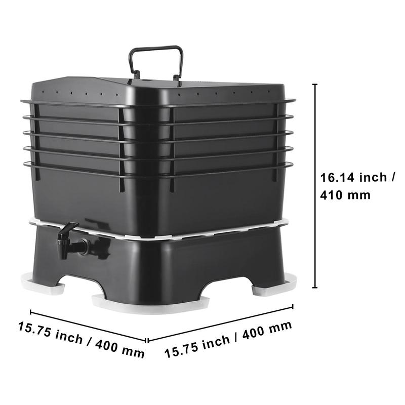 • 50 L Large Capacity: This 50 L worm composter can hold thousands of worms and process several pounds of waste per week. It comes with 5 trays and a collection base with a tap, and the expandable design allows for additional trays. When empty, it measures 15.75x15.75x16.14 inch/40x40x41 cm, and when fully loaded, it extends to 15.75x15.75x25.59 inch/40x40x65 cm.