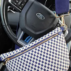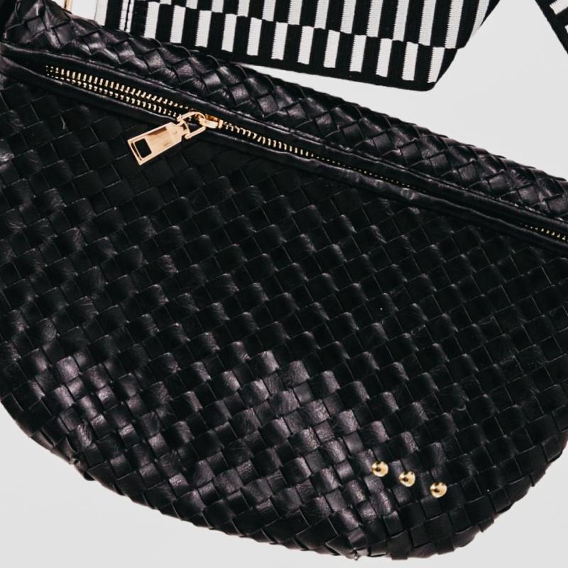 Meet the Westlyn Woven Bum Bag! Gorgeous woven vegan leather available in solid colors with a unique block design on the strap gives us edgy, rocker vibes. We also have it available in checkered prints, and metallic! Beautiful hardware with a zipper closure with beige and black chevron interior, and a zippered slash pocket on the inside. This crossbody bag is the perfect accessory to elevate any outfit!