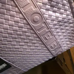 Woven, quilted, very cute. Quality product. It would be considered the Medium size if you were buying the designer version. Quite spacious. The vegan or PU leather is pretty, really soft and smooth. Includes a heart charm, wallet, and long strap. The purple color is divine. Such a nice bag.