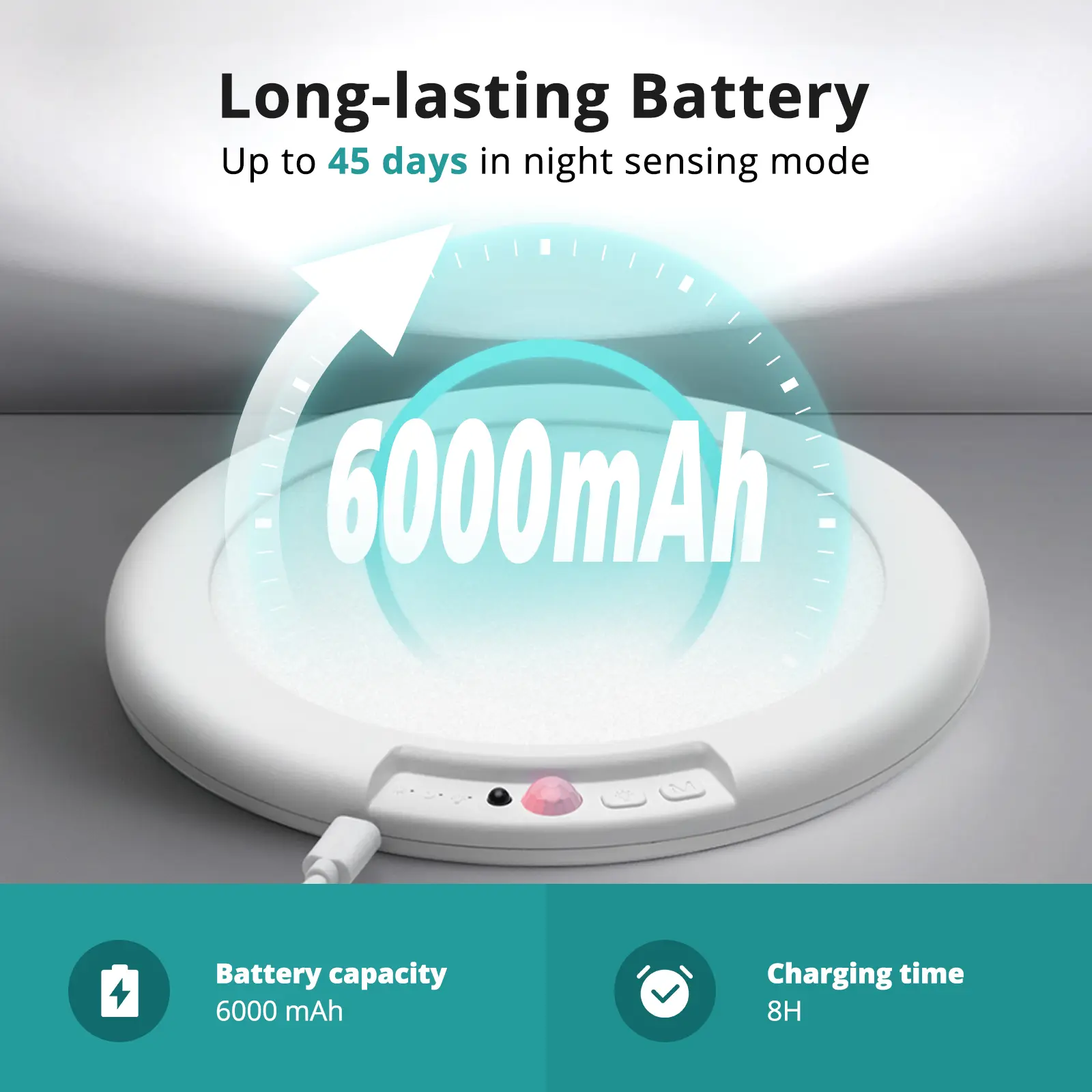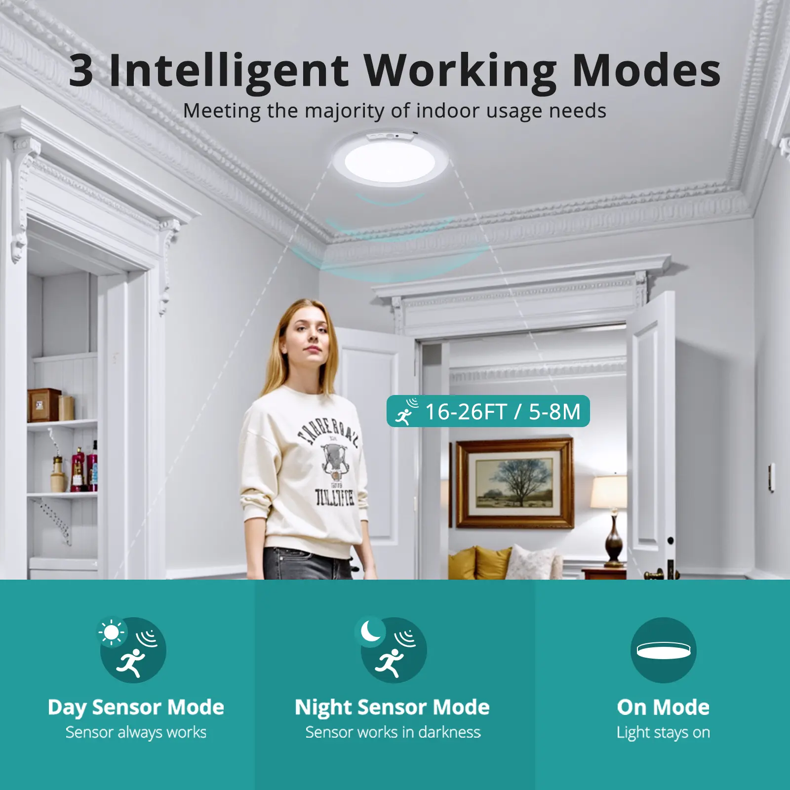 Three Modes of Motion Sensors: Rechargeable closet light have three modes: constant light, night sensing and day sensing. The wireless ceiling light has a 120° detection angle. When it detects movement within a range of 5-8 meters (16-26FT), the light turns on automatically and turns off after 20 seconds