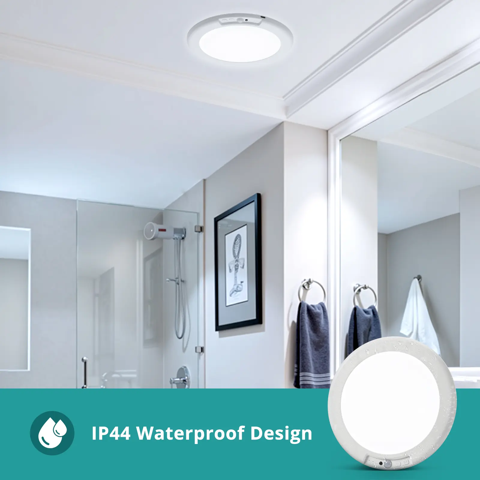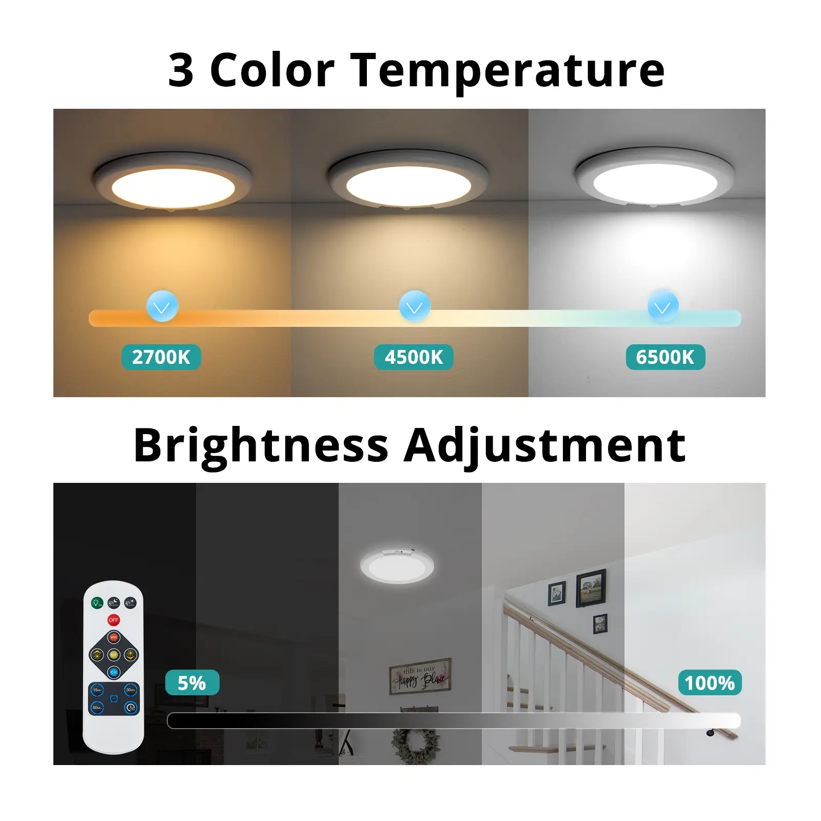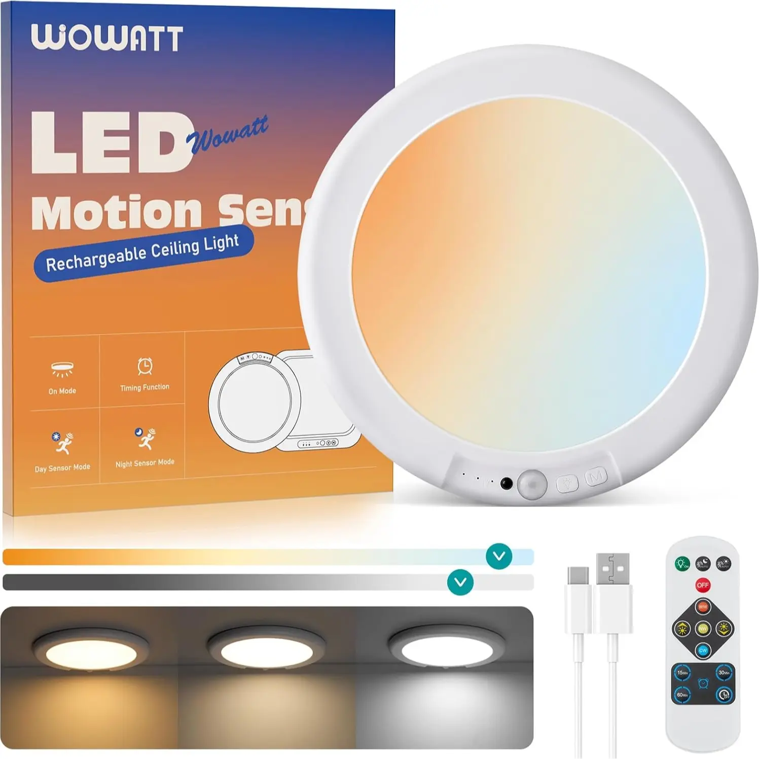 Timing & Dimmable: Wireless motion sensor ceiling lights brightness is 250 lumens, timing & dimmable, 3 color temperature adjustable, color temperature is 3000K/4500K/6500K, with memory function you can adjust the color temperature and brightness according to your needs