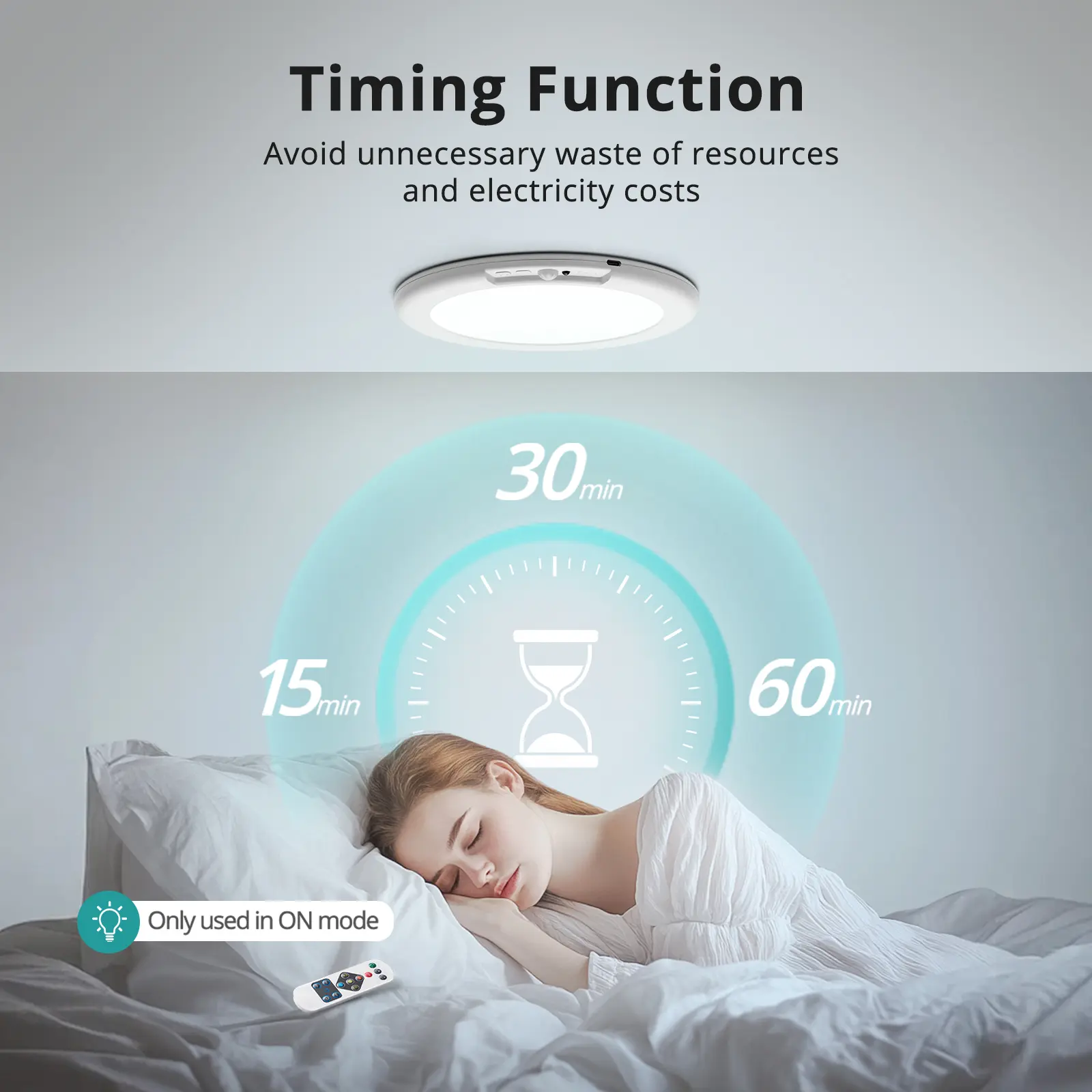 Wireless Ceiling Light with Remote: Manual control and remote control, "M": long press to switch, short press to switch the three sensing modes; "Bulb": long press to adjust brightness, short press to adjust color temperature. Remote control are able to control the switch, brightness, color temperature and timer function, timer were 15min, 30min, 60min, remote control range 5-8 meters (16-26FT) available