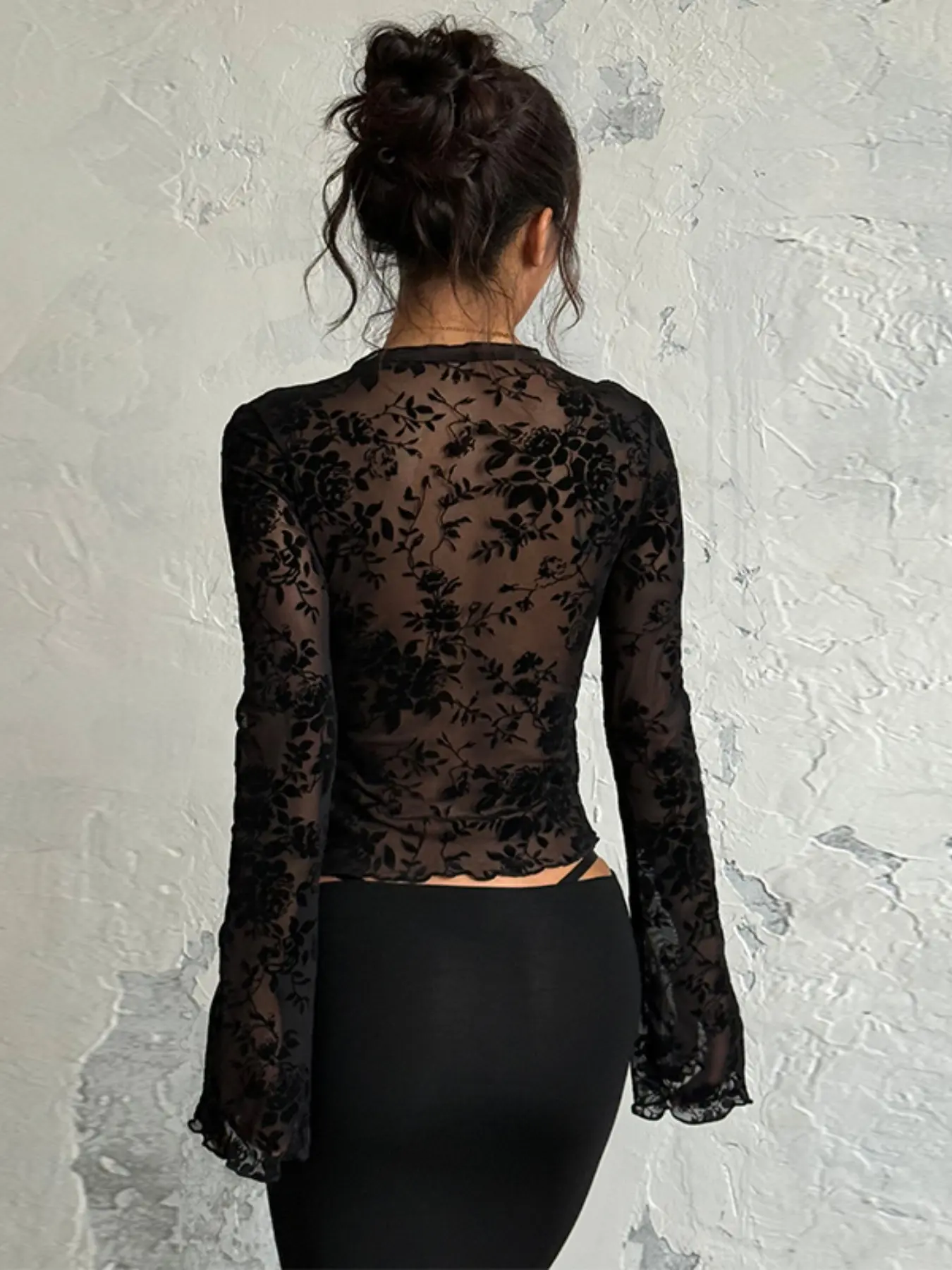 Women's Plain Ruffled Bell Sleeve Top, Sexy Slim-Fitting Graphic Blouse, Fall Fashion, Women's Casual Wear, Stylish and Comfortable