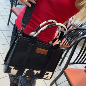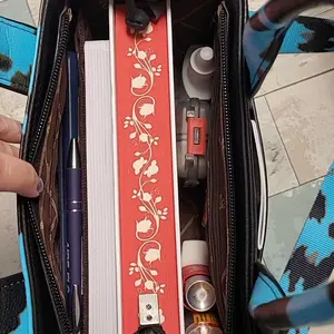 This is the cutest purse I have ever had! It’s a little small for me but has several pockets on the inside and a zip pocket inside. Has an outside pocket that holds my phone perfectly! Has a zipper to close. Very well made! Sturdy! Braded leather on the front. The print is so awesome! Well worth it!