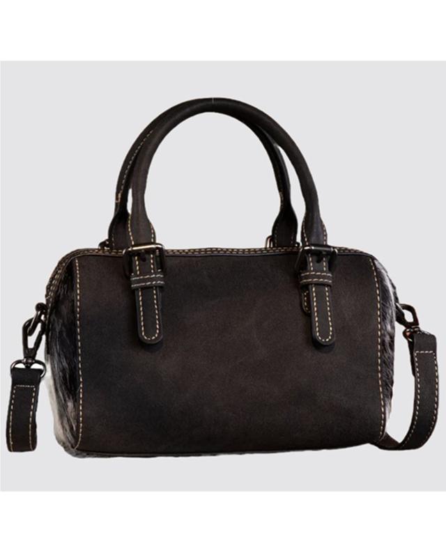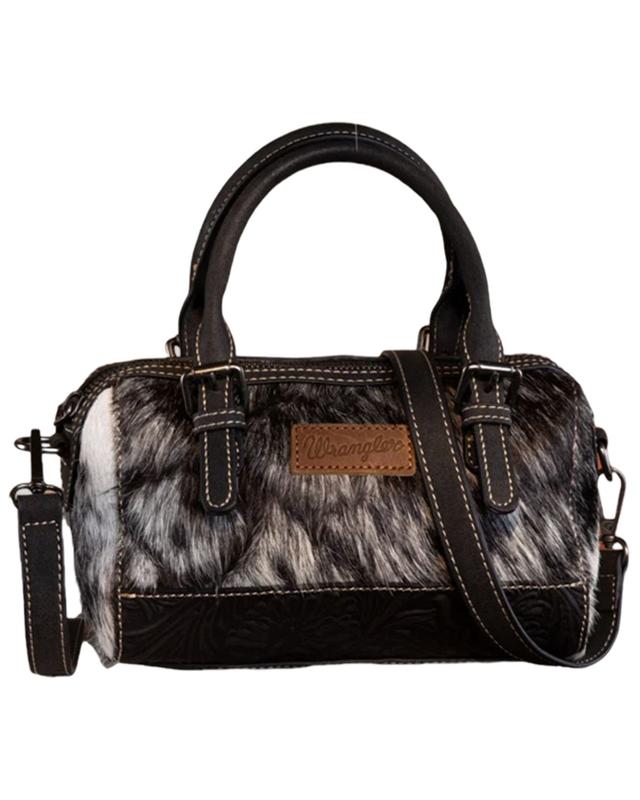 Genuine hair-on cowhide on front and sides. Floral tooled panel at bottom. Top zipper closure. 1 zippered pocket and 3 card slots on interior. Double round handle. 4.5" handle strap drop and 46" crossbody strap drop. Detachable adjustable crossbody strap. 8.5" x 3" x 6". Product may vary due to assorted hides.