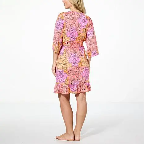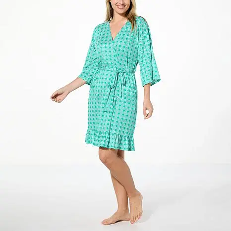 Comfort Code Soft & Light Wrap Robe with Ruffle Hem Savor your morning cup of Joe or snuggle up with a good book and a great glass of rosé wrapped in this kimono-style wrap robe with a ruffled hem made for days and nights spent relaxing in style.