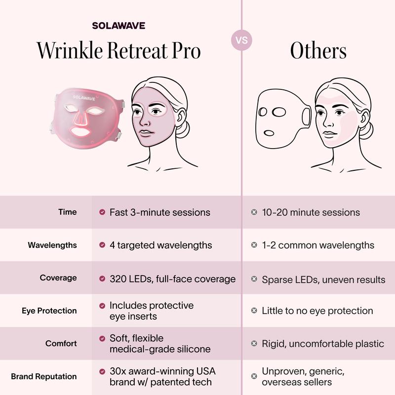 ✨ Discover the Wrinkle Retreat Pro LED Face Mask, the anti-aging treatment that runs itself. Four wavelengths work simultaneously to target fine lines, wrinkles, firmness, and tone across your entire face, all in a three-minute hands-free session. The flexible medical-grade silicone fits comfortably and stays put while you get on with your morning rituals.