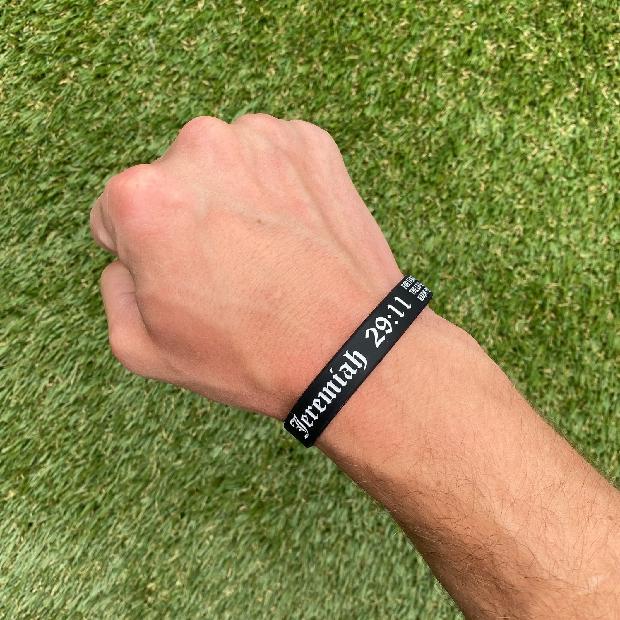 Motivation might not always be there, but Elite Athletic Gear wristbands are designed to help inspire, encourage and remind you to keep pushing towards your goals. Confidently wear them throughout your day at the gym, on the field, at work or while going out. Jeremiah 29:11 - For I know the plans I have for you, declares the Lord, plans to prosper you and not to harm you, plans to give you hope and a future. DURABLE: Made of high quality silicone with debossed lettering that will not chip or fade for years. INSPIRE: Yourself, friends, family, teammates, classmates or co-workers with daily positivity. SIZES FOR ALL: We offer 3 sizes to accommodate all wrist sizes. YOUTH 7” - STANDARD 8” - XL 9” (See sizing guide) SOLD INDIVIDUALLY: You will receive 1 bracelet. WRISTBAND COLOR: Black PAINT COLOR: White