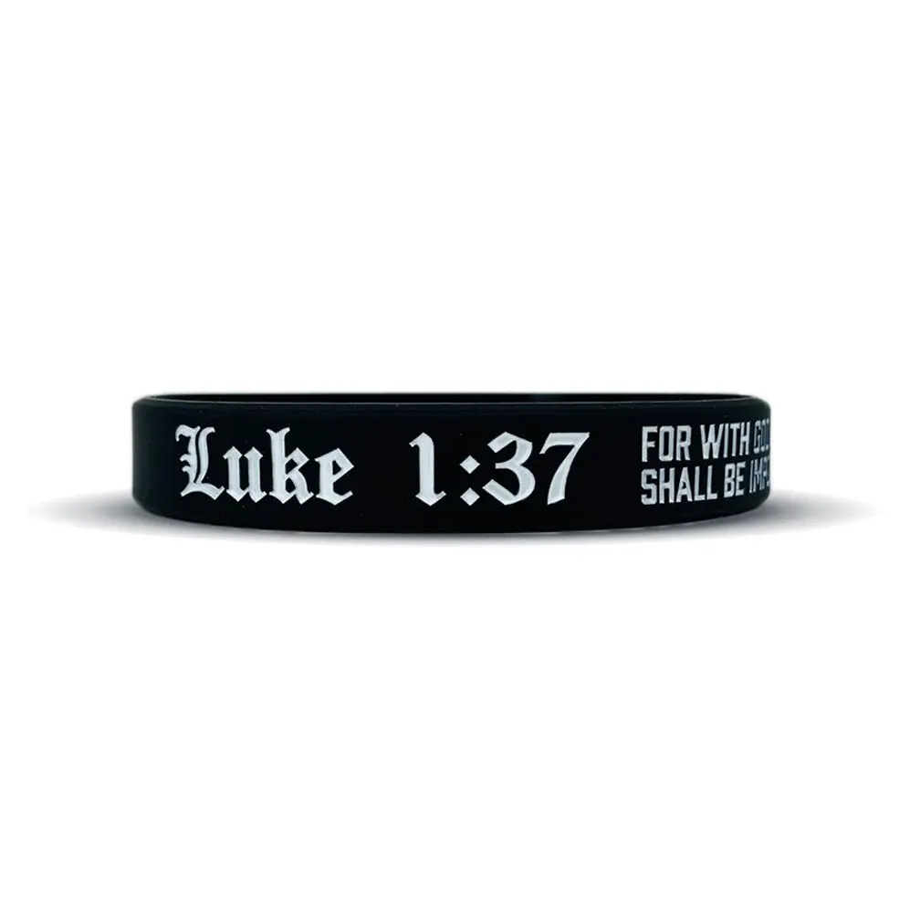 Motivation might not always be there, but Elite Athletic Gear wristbands are designed to help inspire, encourage and remind you to keep pushing towards your goals. Confidently wear them throughout your day at the gym, on the field, at work or while going out. Luke 1:37 - For with God nothing shall be impossible. DURABLE: Made of high quality silicone with debossed lettering that will not chip or fade for years. INSPIRE: Yourself, friends, family, teammates, classmates or co-workers with daily positivity. SIZES FOR ALL: We offer 3 sizes to accommodate all wrist sizes. YOUTH 7” - STANDARD 8” - XL 9” (See sizing guide) SOLD INDIVIDUALLY: You will receive 1 bracelet. WRISTBAND COLOR: Black PAINT COLOR: White