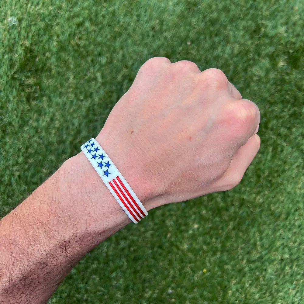 The wristband for those who bleed red, white and blue. Confidently wear them throughout your day at the gym, on the field, at work or while going out.  DURABLE: Made of high quality silicone with debossed lettering that will not chip or fade for years. INSPIRE: Yourself, friends, family, teammates, classmates or co-workers with daily positivity. SIZES FOR ALL: We offer 3 sizes to accommodate all wrist sizes. YOUTH 7” - STANDARD 8” - XL 9” (See sizing guide) SOLD INDIVIDUALLY: You will receive 1 bracelet. WRISTBAND COLOR: White PAINT COLOR: Red & Blue