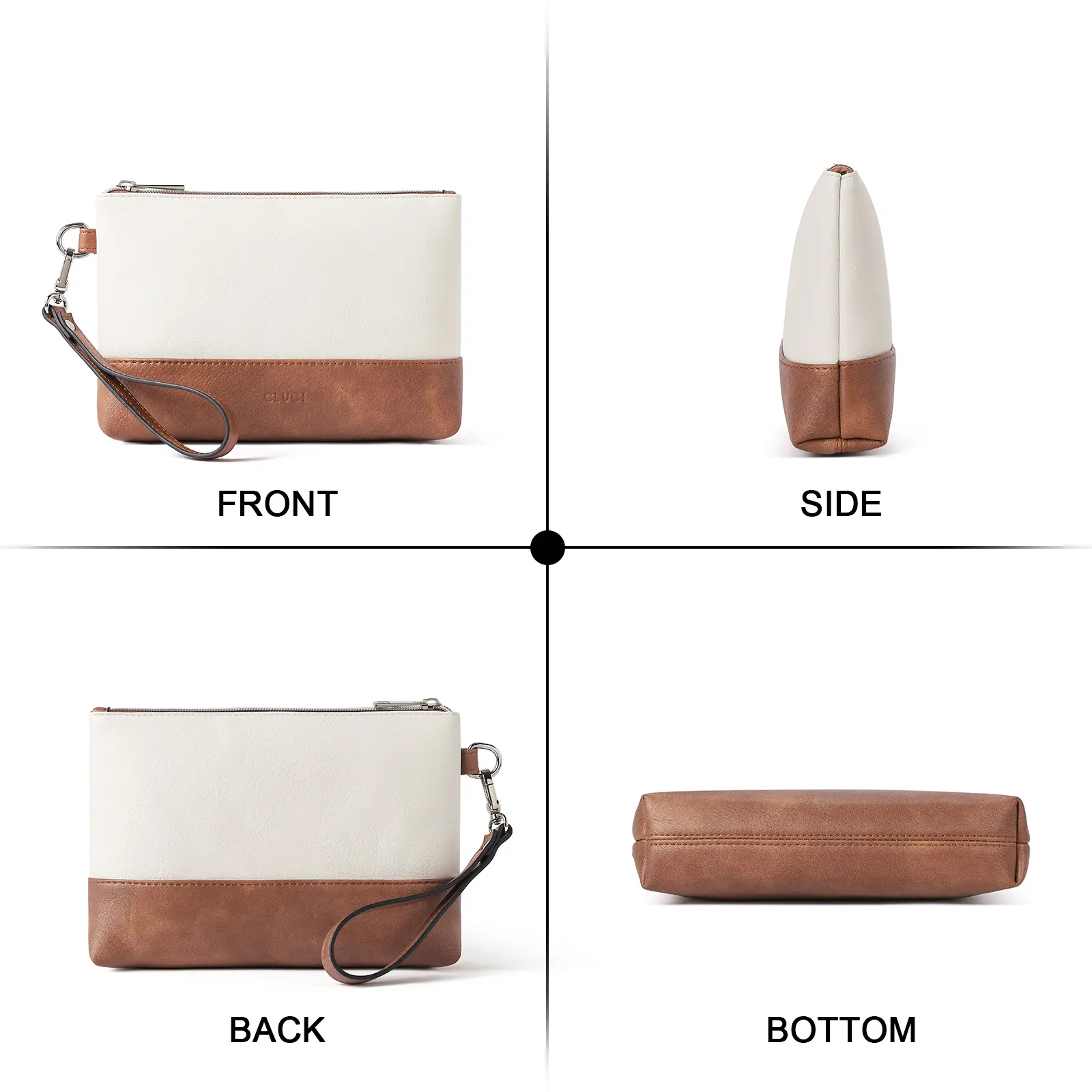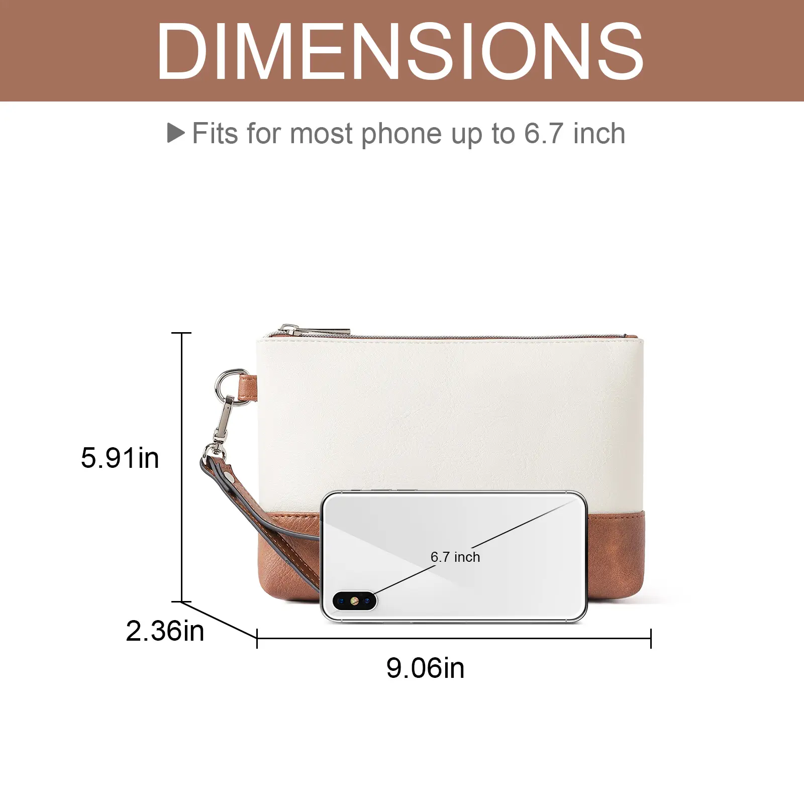 Measuring (long) 9.06 x (width) 5.91 x (height) 2.36 inches with a 7.87 - inch long wristlet, it has 6 credit card slots and 1 zip pocket. It can hold all smartphone models, credit cards, and other cards. The main pockets are spacious enough for travel passports, cash, large wallets, cosmetics, and small essentials.