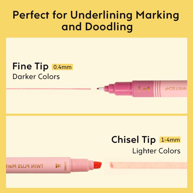 ·DOUBLE ENDED DESIGN: Dual-ended marker features darker color fine felt tip and lighter color chisel tip so you can quickly switch between fine lines (0.4mm) and broad strokes(1mm-4mm). Chisel tip for marking and coloring, and fine tip for writing and outlining.