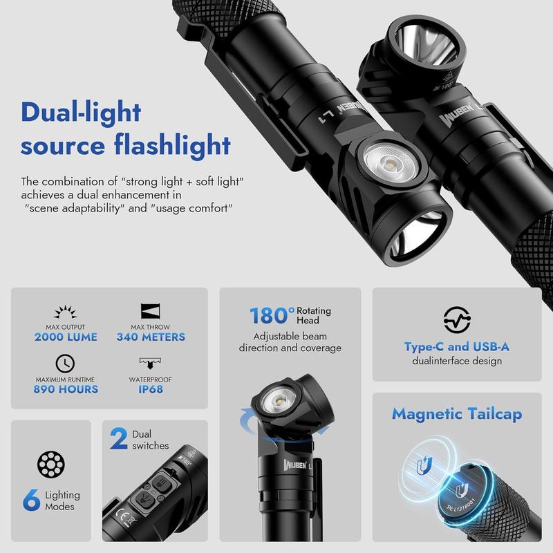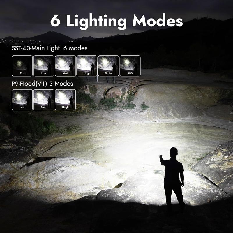 • Dual-Swivel Lighting System: 180° rotating head with independent spotlights (6 modes, including SOS) and floodlights (3 modes). Delivers 2000 lumens with 350m beam distance.