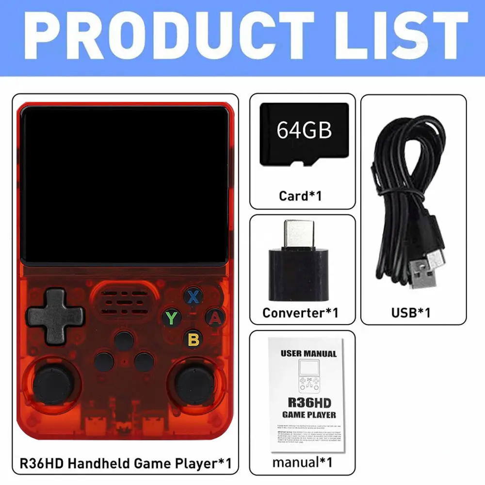 Dive into nostalgia with the WUDS R36HD Retro Handheld Games Console. It features an open-source system and a 3.5" IPS screen. This portable gaming player supports over 20000 classic games. Perfect for travel, it's a great gift for teens or partners. The console includes a 64GB TF card for ample storage.