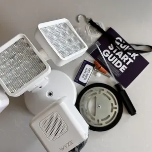 ·In the Box: Wyze Cam Floodlight Pro, bracket screws, mounting bracket, ground wire screw, floodlight screw, rubber stopper, hook, screwdriver