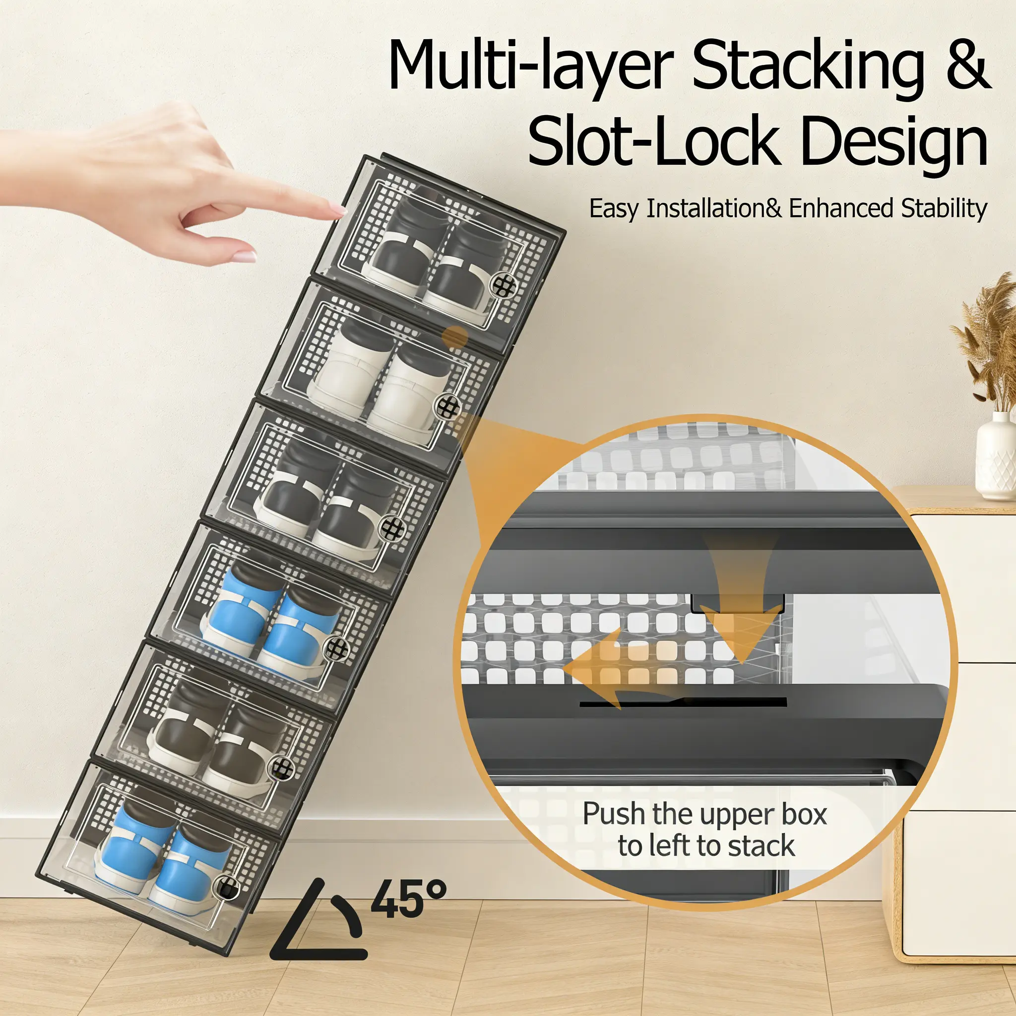 X-Large Shoe Storage Boxes Organizers Clear Plastic Stackable 12 Pack, Shoe Rack & Holder Substitute, Sneaker Containers, Toy Storage Organizer Bins for Entryway, Closet, Under Bed, Black
