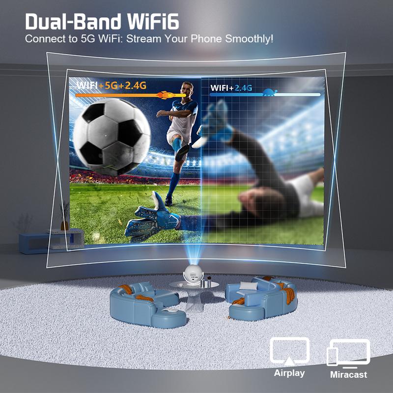 The projector features 2.4/5G WiFi and BT6.0 for seamless connectivity. It supports multiple devices, making it versatile for different uses. Ideal for home cinema and outdoor activities.